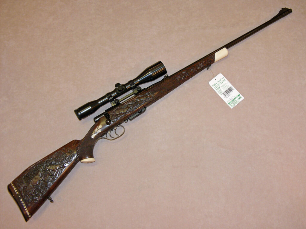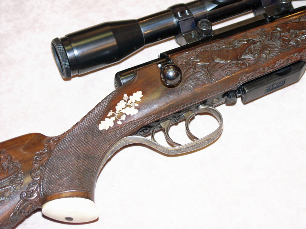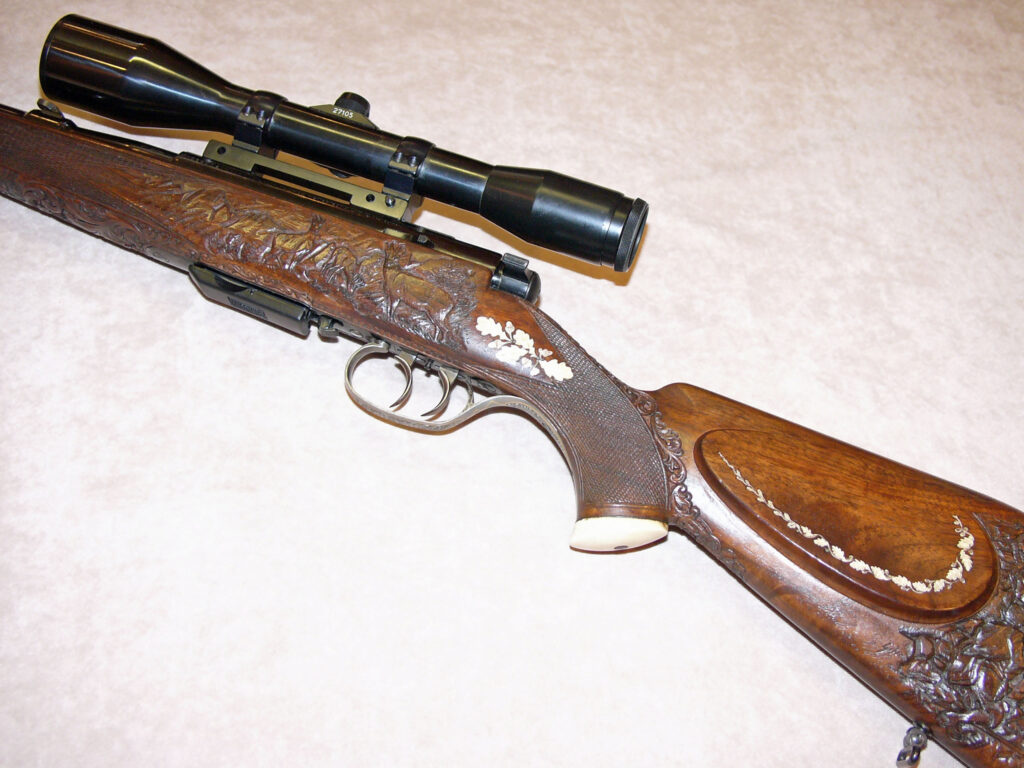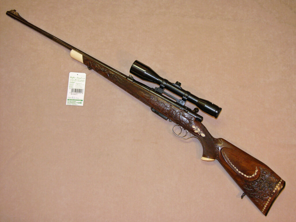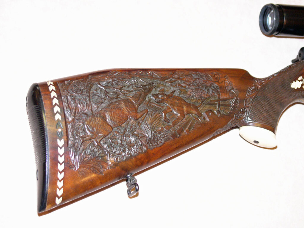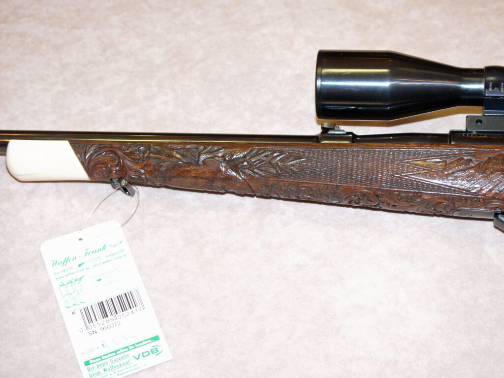 herausnehmbares 3-Schuss-Magazin, deutscher Stecher, Aufschubmontage mit ZF Schmidt & Bender / Alljagd 6×42 / Stahl Absehen 4, Schaft mit reichhaltiger, flächendeckender Schaftverschneidung mit Tier- und Jagdmotiven, Pistolengriff und Vorderschaftabschluss aus Elfenbein, ebenso hochwertige Schafteinlage in Elfenbein, grau gebeizter Abzugsbügel mit Gravur und Goldrauteneinlage……. für den Liebhaber exklusiver Waffen………