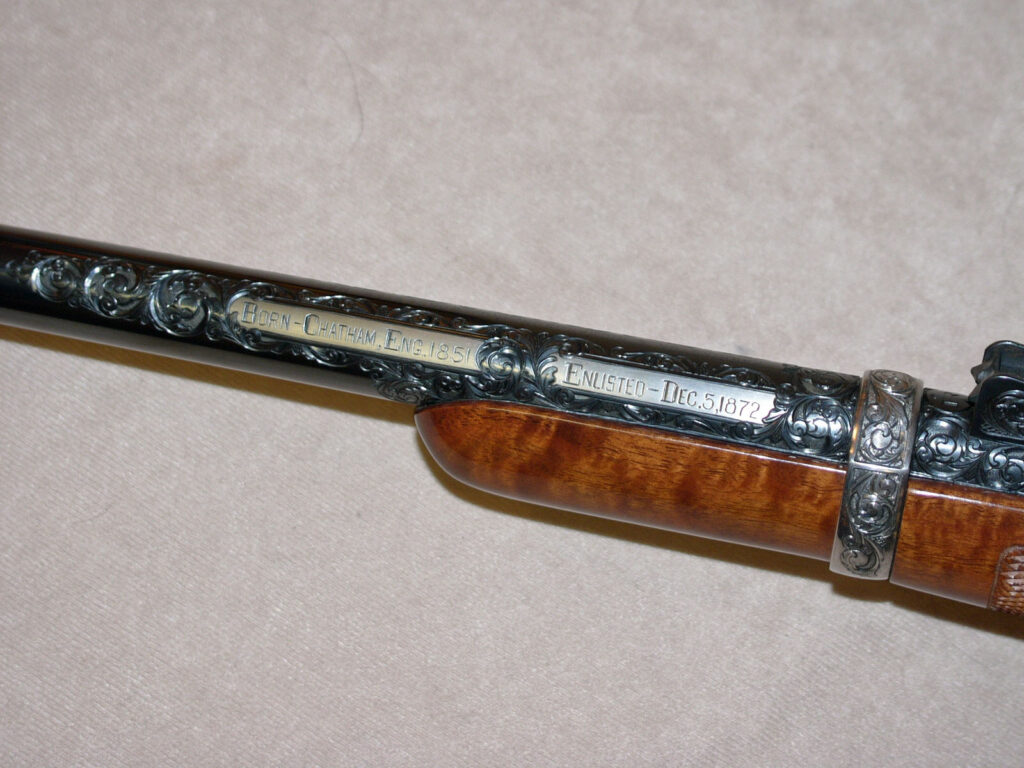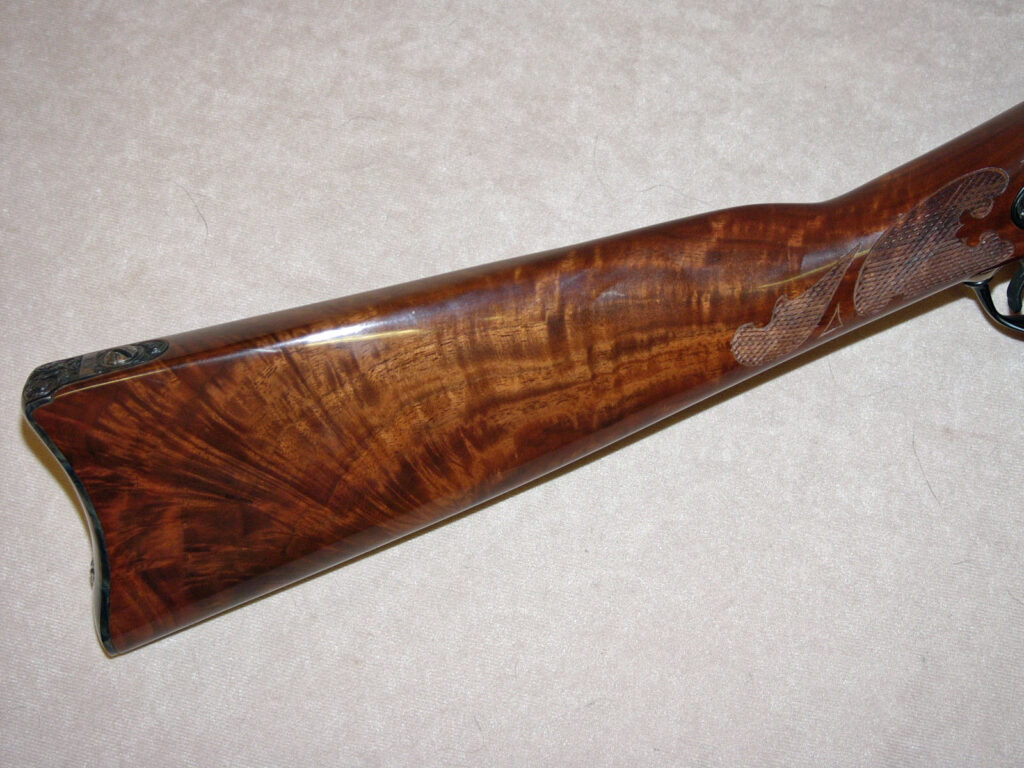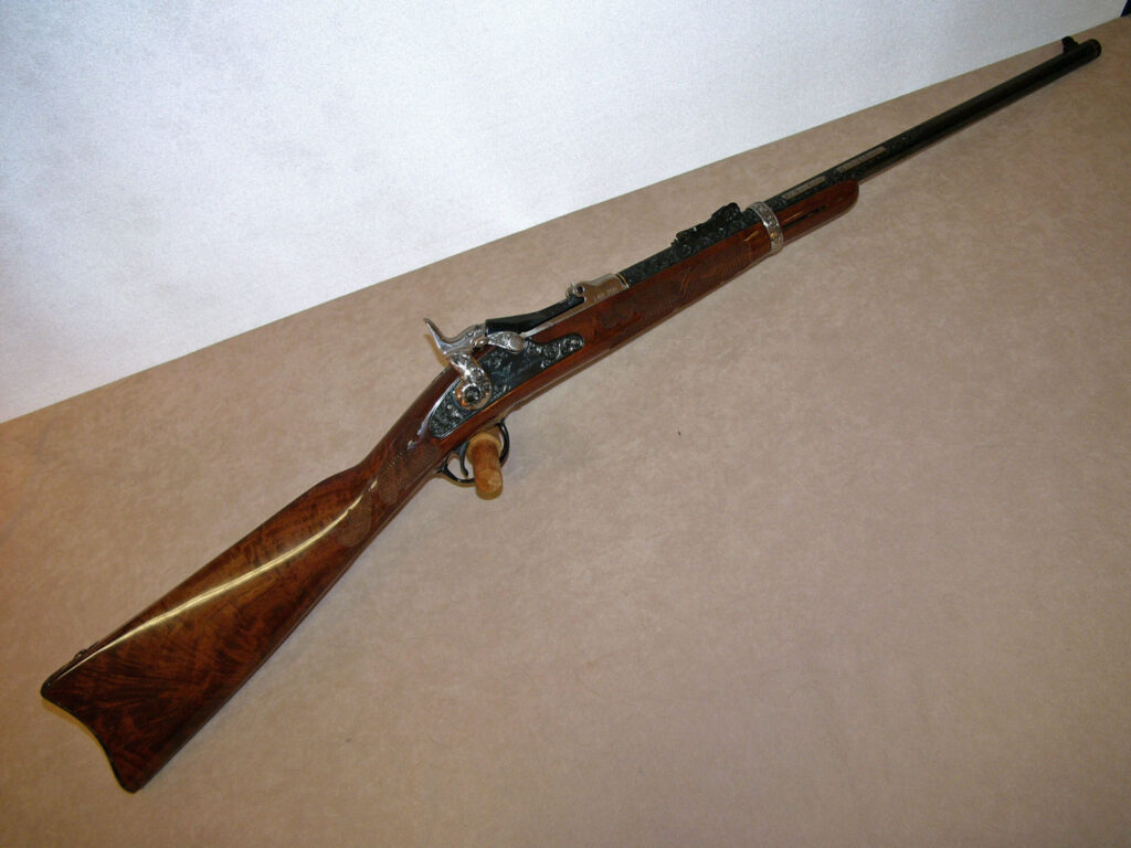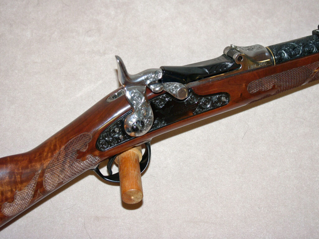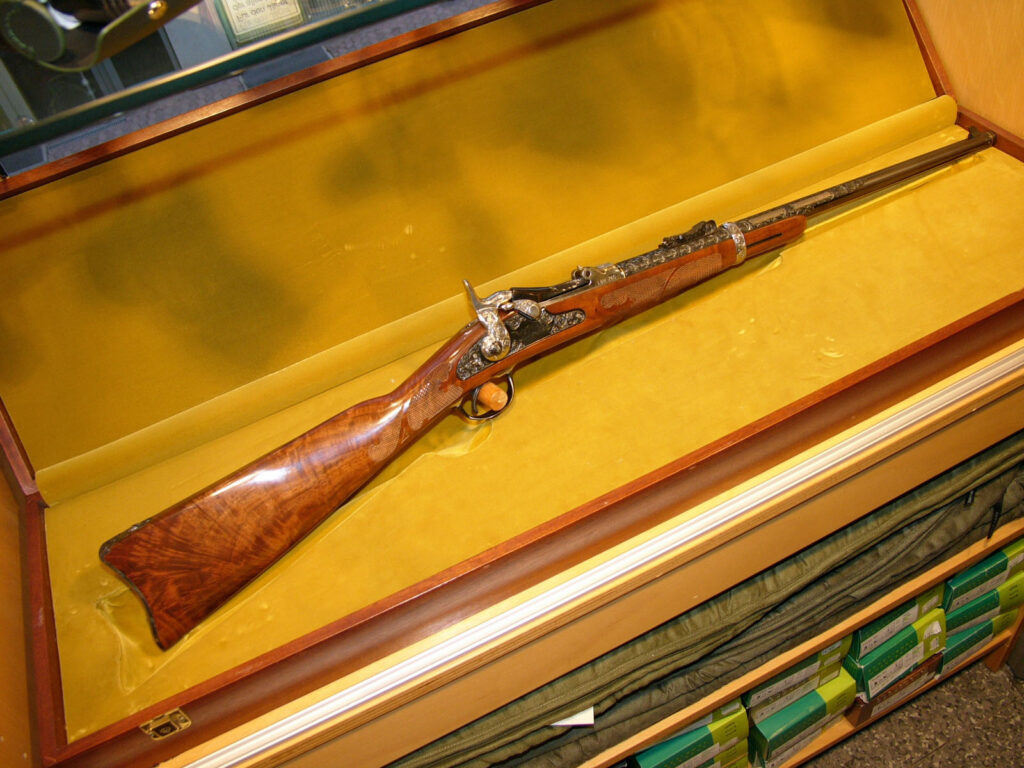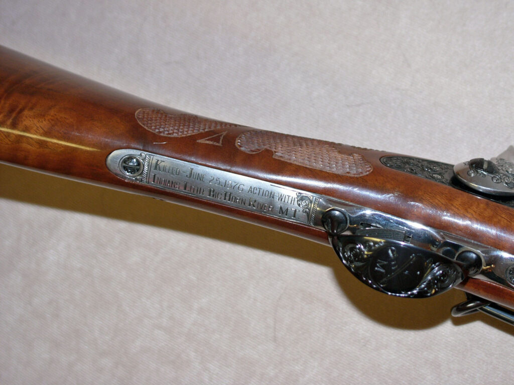mit deutschem Beschuss 1976, limitiertes Sondermodell (Weltauflage 100 Stück) „Custer Memorial“, hochwertige, limitierte Neuauflage mit tiefgestochener, flächendeckender Blattarabeskengravur und Goldfadeneinlage, Metallteile im polierten Hochglanz-Finish zum Teil blank oder hochglanzbrüniert, mit Sonderbeschriftung auf Lauf und Abzugsbügel z. B. „Killed – June 25.1876 Action with Indians Little Big Horn River M. T. „ Schaft aus hochwertigem Wurzelholz mit handgeschnittener Fischhaut in Lackfinish, Schaftkappe graviert und bunt-eingesetzt, die Waffe befindet sich in einem Holzkasten, der mit grünem Samt ausgeschlagen ist, mit 2 Büchern im Schuber als Sonderausgabe dazu gefertigt… en Traumstück für jeden Sammler……………