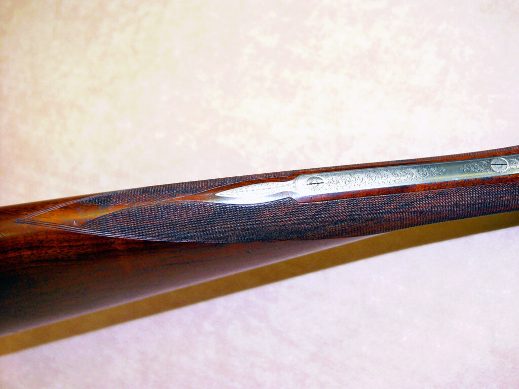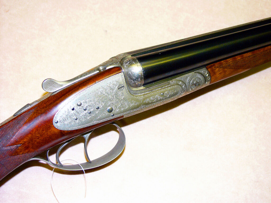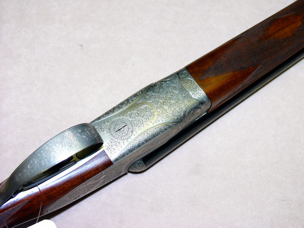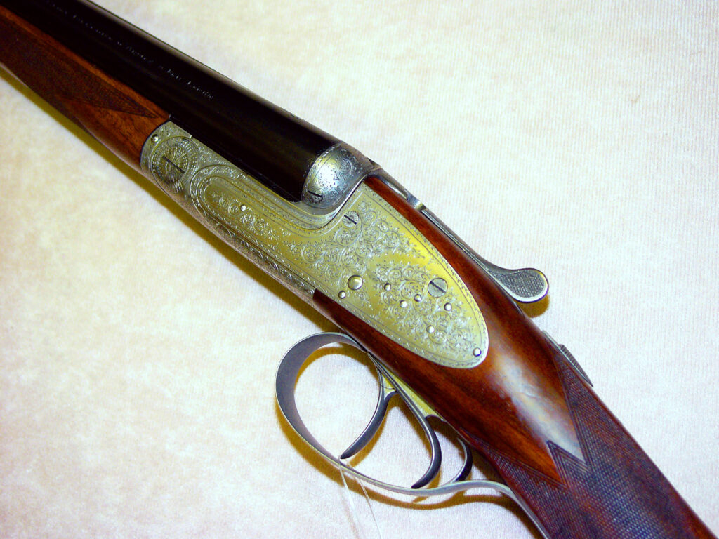 feinste belg. Büchsenmacher-, Schäfter- und Graveur-Meisterarbeit in Seitenschloss-Ausführung à la Holland & Holland, Ejektor, Doppelabzug, vorderer Abzug mit Rückgelenk, doppelte Laufhakenverriegelung mit Purdeynase, beide Laufpaare mit gleichem Choke ¼ – ¾, Gewicht pro Flinte 2,85 kg, elegante Schaftform aus gut gemasertem belg. Nussbaummaserholz, Vorderschaft mit Purdeyschnäpper, engl. Hinterschaft mit elegantem Hals und feinster Fischhaut, Hinterschaft ohne Schaftkappe Länge 375 mm, übrige Maße sind Standard, feinste flächendeckende Arabeskengravur auf grauem Systemkasten, Abzugsbügel und den Bedienelementen, auf dem Verschlusshebel jeweils in Gold Nr. 1 und Nr. 2 eingelegt, braunes Lederfutteral mit echter Schaffell-Fütterung für Schwersternflinten……. so elegant und leicht wie ein 20er –Pärchen, jedoch mit breiterer Patronenauswahl…….