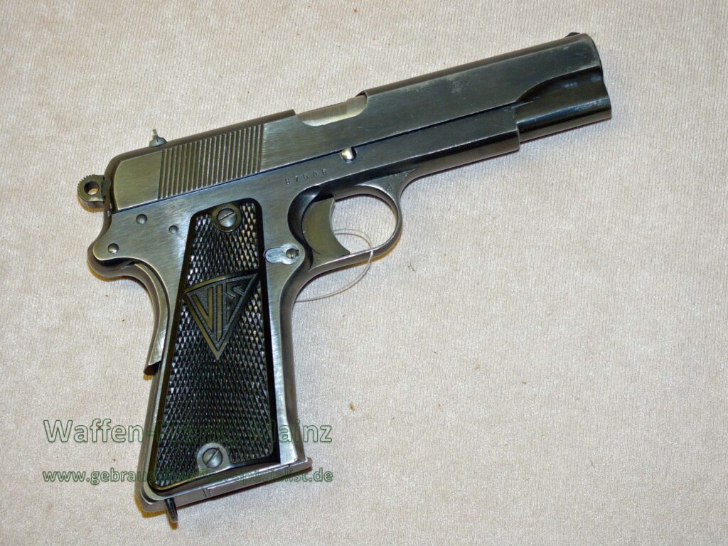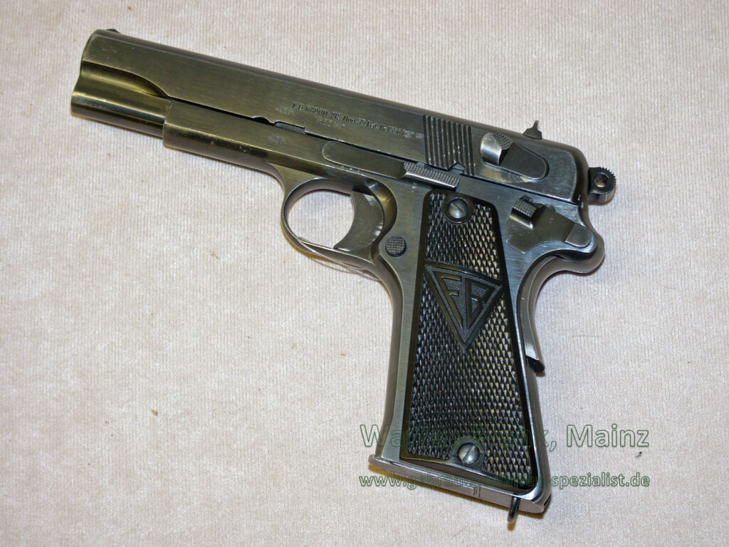 Originalzustand nicht überarbeitet, mit gut sichtbarem WaA-Stempel und Zusatzbeschriftung “p.35(p)”, lediglich Wetzstellen durch Ledertasche auf den Kanten, einschl. Reservemagazin und gestempelte Originaltasche, Griffstück noch mit zusätzlicher Anschlagschaftnute….. ein echtes Sammlerstück ohne weitere Fremdstempel…….