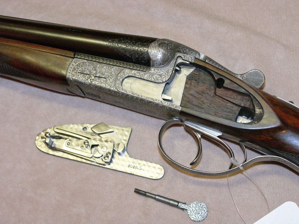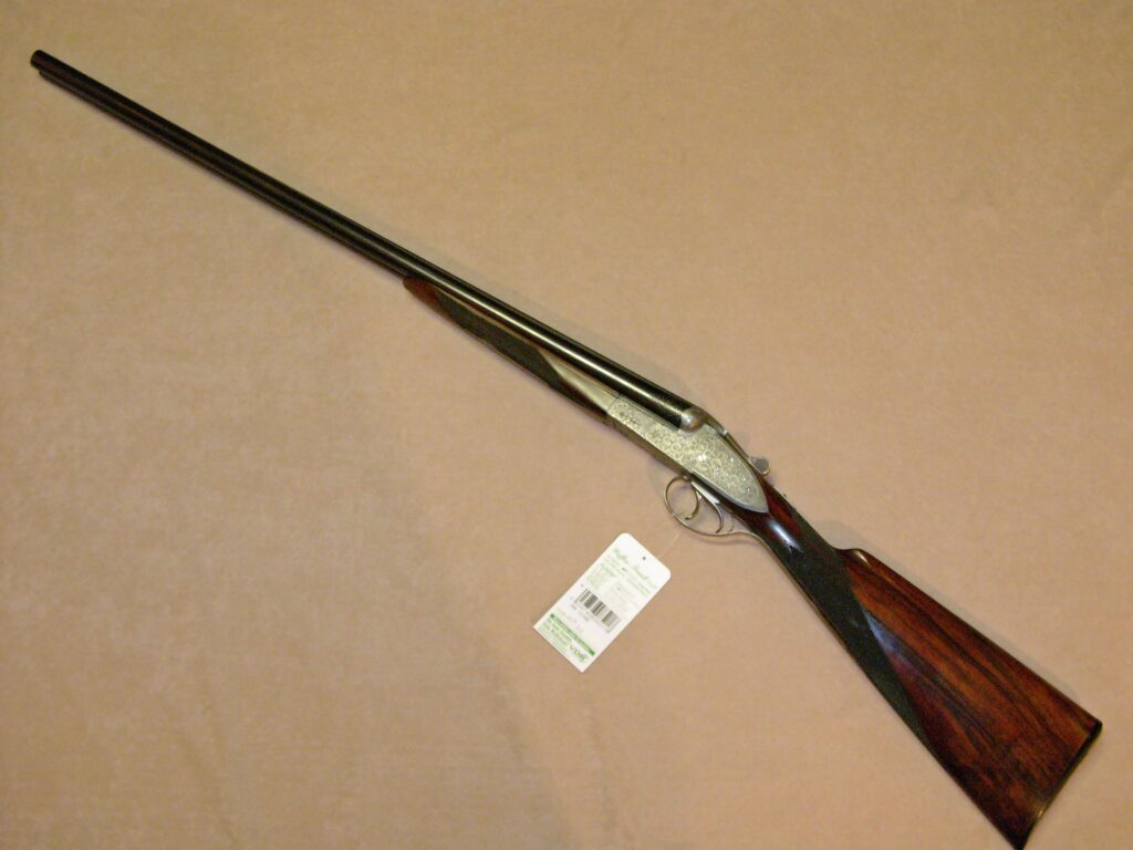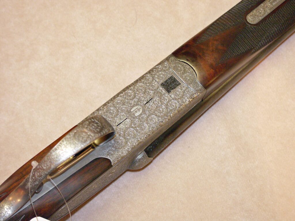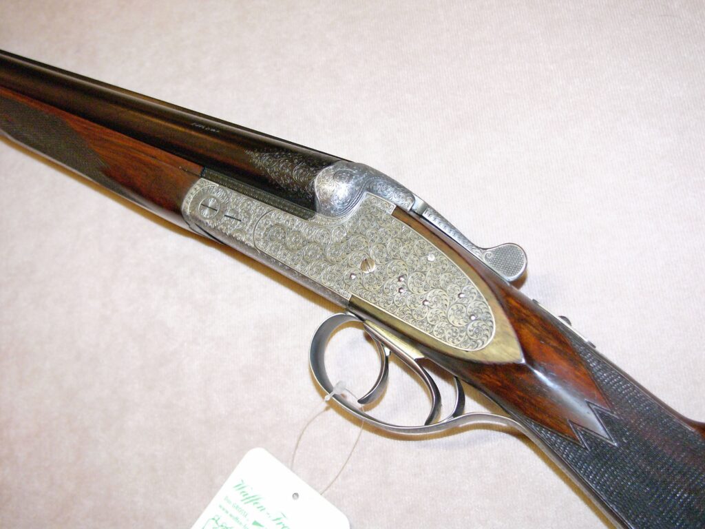Selten geschossene Schrankwaffe aus Sammlungsauflösung, es wurden weniger als 200 Stück von 1960-70 in feinster Büchsenmachermeister-Handarbeit gefertigt, von Hand herausnehmbare Seitenschlosse, unten liegender Fangstangen und seitlicher Signalwelle, doppelte Laufhakenverschluss mit zusätzlichem Greener Verschluss, Ejektor H & H, Choke ½ -1/1 (die Universalbohrung auf für Weicheisen Nr. 4 geeignet), Doppelabzug mit Rückgelenk, fein guillochierte hochliegende Churchill-Schiene, grau gebeizter Stahlkasten mit handgestochener Arabesken-Lupen-Gravur sowie Laufwurzel, Vorderschaftschnäpper und Abzugsbügel, klassische englische Schäftung aus gut gemasertem Nussbaumwurzelholz mit tiefgezogener handgeschnittener Fischhaut, Schaftlänge einschl. schwarzer Kunststoffkappe 365 mm ……… ein Stück in höchster Qualität für den Liebhaber klassischer Flinten………..