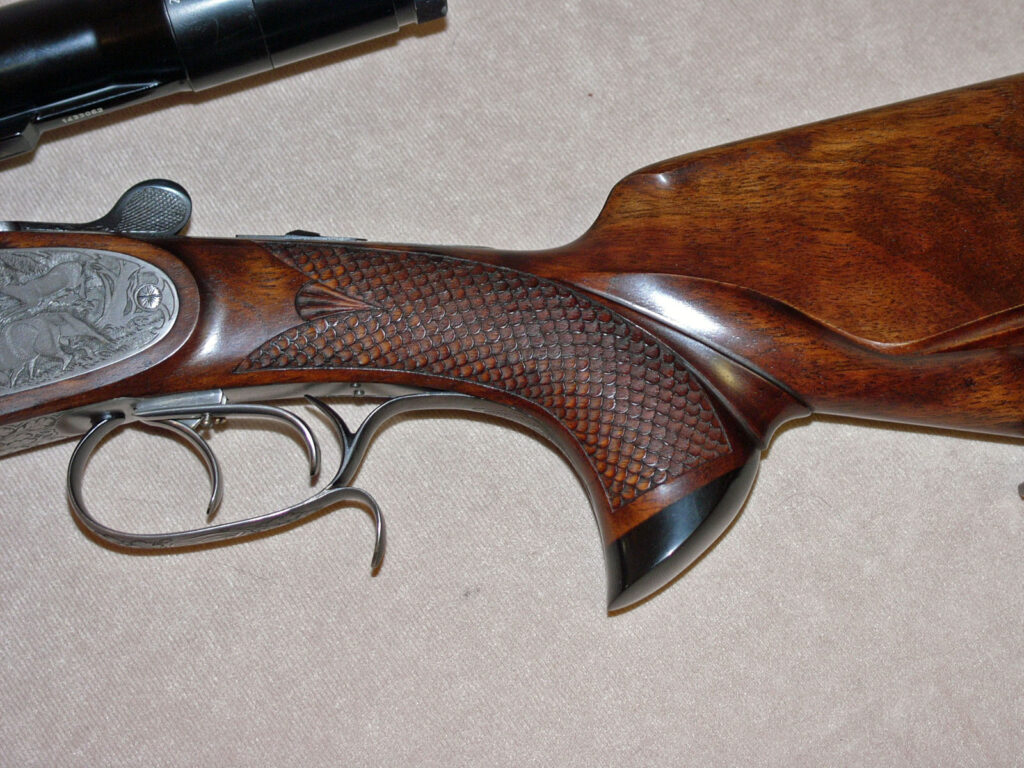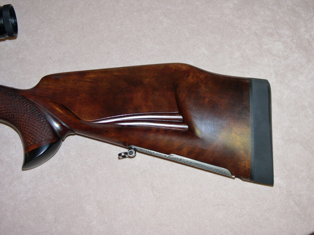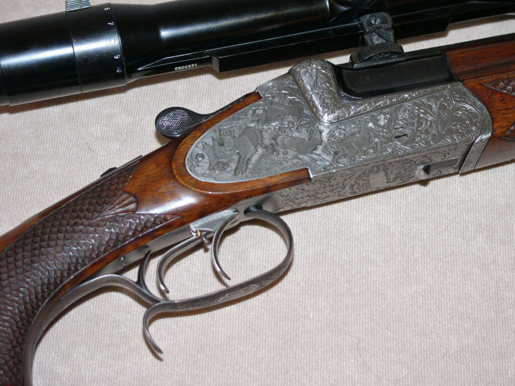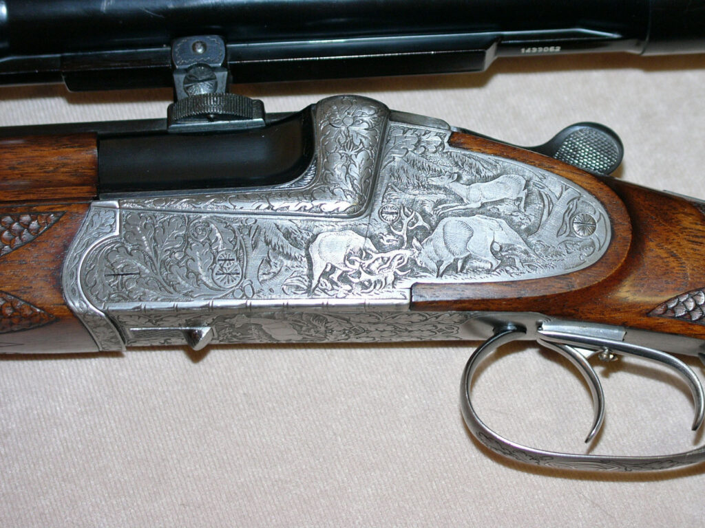 mit feinem Blitzschloss und langen Seitenplatten, doppelte Stechereinrichtung, Abzugsbügel mit Fingerhaken, Suhler-Einhakmontage mit ZF Zeiss 2,5-10×52 / A 4, gutes zusammen Schiessen mit reservierter RWS-Munition, geteilter Vorderschaft, Hinterschaft mit Schweinsrücken und bayrischer Backe sowie Schaftmagazin, Länge einschl. schwarzer Gummikappe 370 mm, handgestochene Schuppenfischhaut, flächendeckende Jagdstückgravur, Gams und Rotwildbrunft mit Eichenlaubeinrahmung, Schaftmagazin mit Hundemotiv
