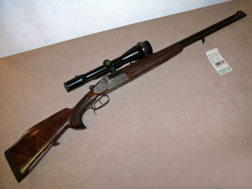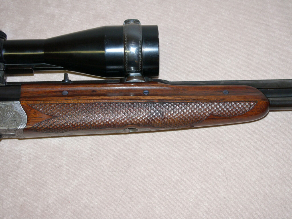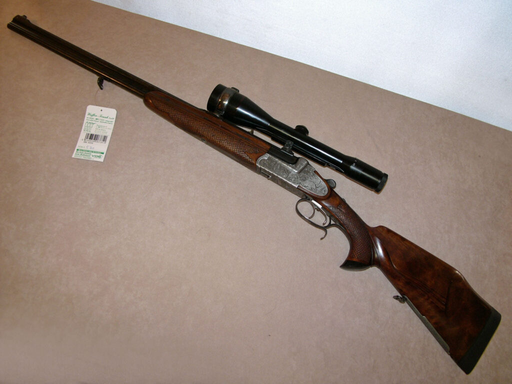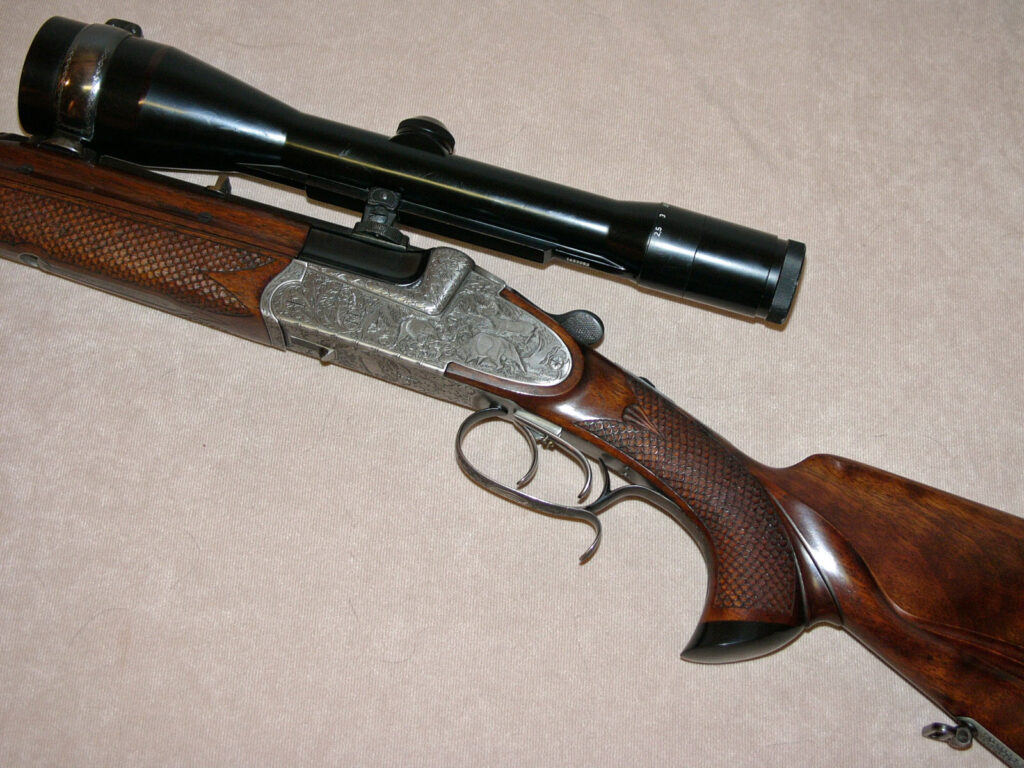 mit feinem Blitzschloss und langen Seitenplatten, doppelte Stechereinrichtung, Abzugsbügel mit Fingerhaken, Suhler-Einhakmontage mit ZF Zeiss 2,5-10×52 / A 4, gutes zusammen Schiessen mit reservierter RWS-Munition, geteilter Vorderschaft, Hinterschaft mit Schweinsrücken und bayrischer Backe sowie Schaftmagazin, Länge einschl. schwarzer Gummikappe 370 mm, handgestochene Schuppenfischhaut, flächendeckende Jagdstückgravur, Gams und Rotwildbrunft mit Eichenlaubeinrahmung, Schaftmagazin mit Hundemotiv