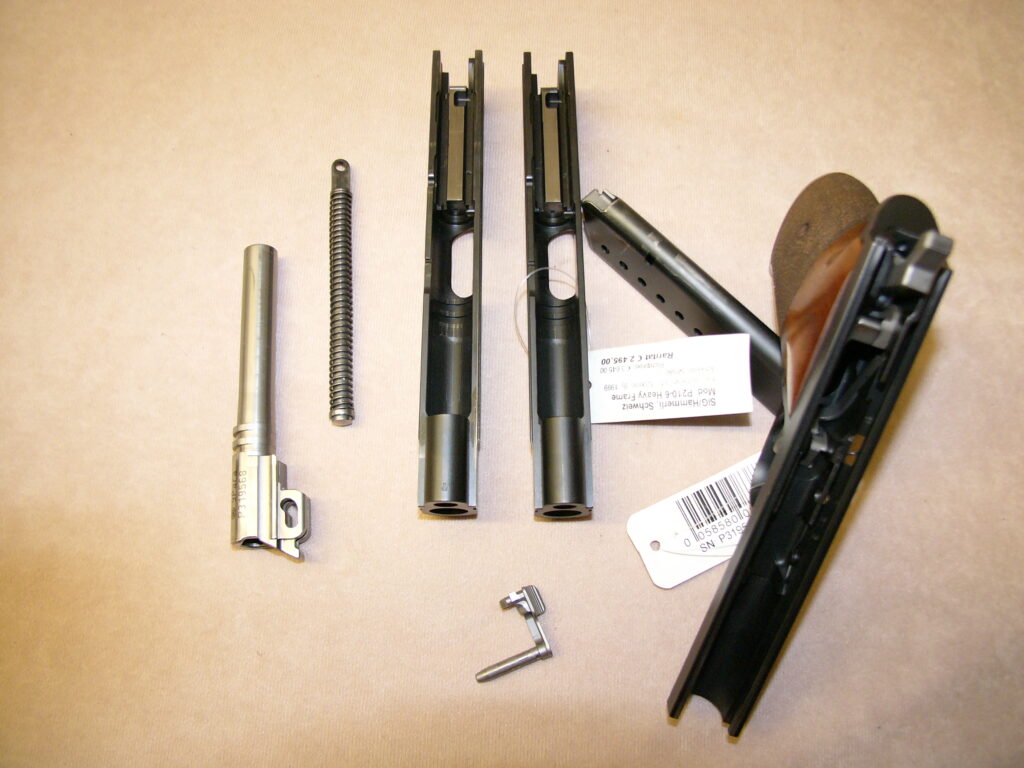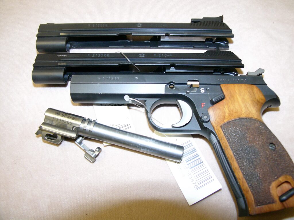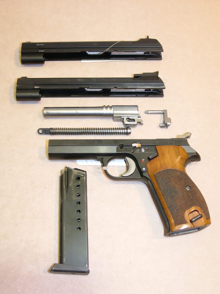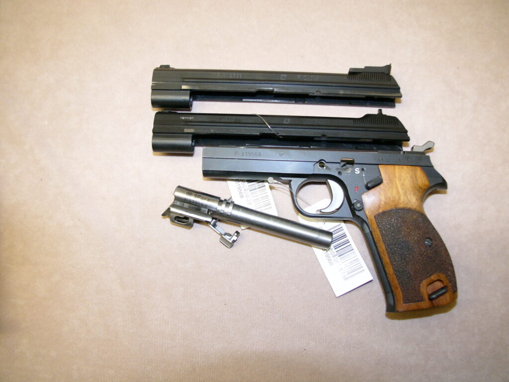 mit zweitem nummerngleichem Schlitten (P 2104-4) mit militärischem starren Visier, Oschatz-Umbau mit obenliegendem Magazinknopf und Checkering an Griffstückvorderseite und Abzugsbügel, Magazin mit Aluschuh, punzierte Griffschalen aus Nussbaumholz …… noch in allerhöchster Präzision und Feinarbeit gefertigt……….