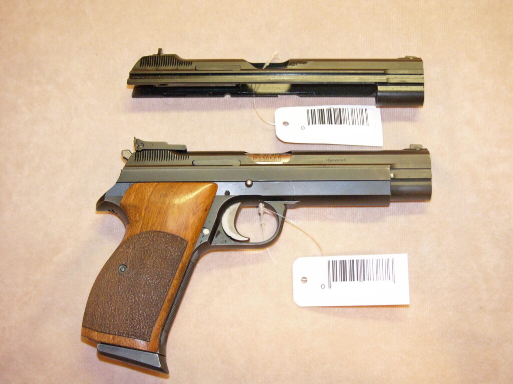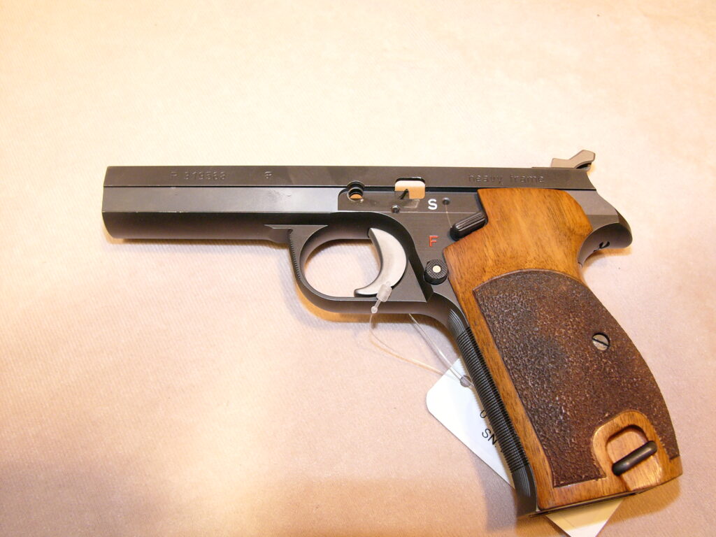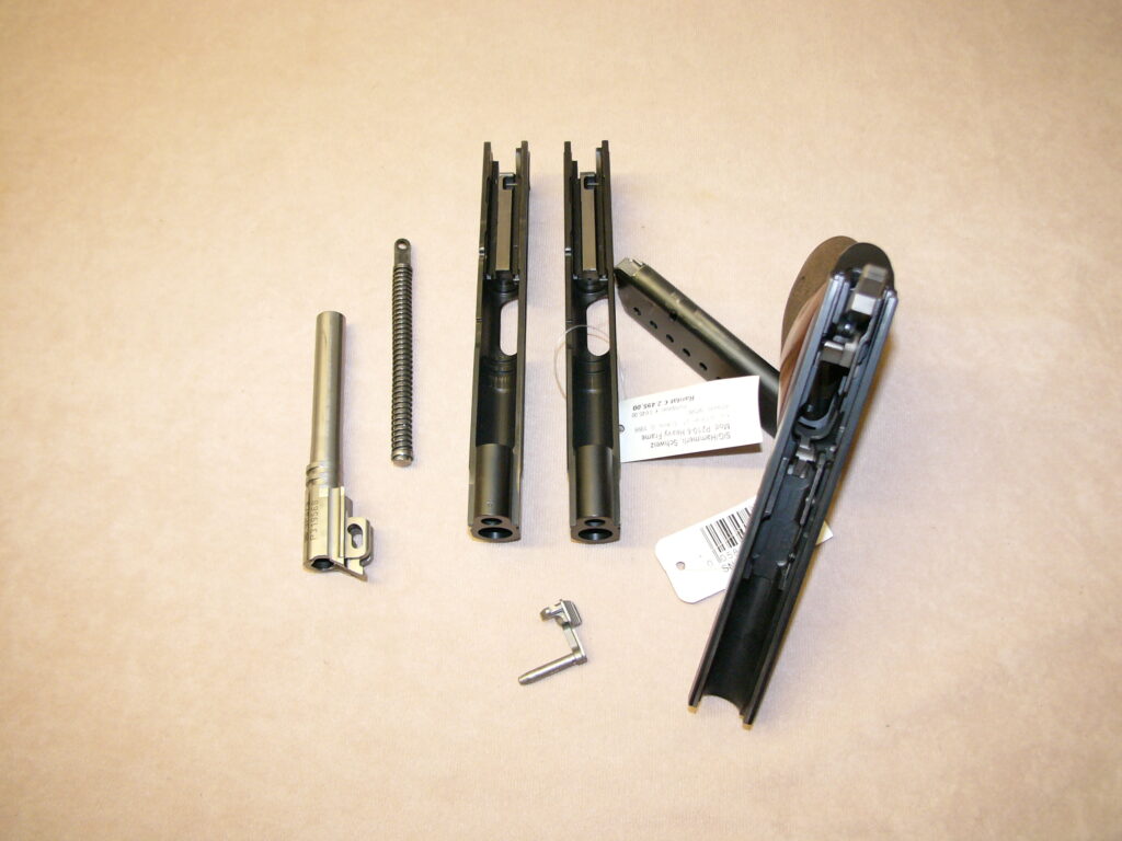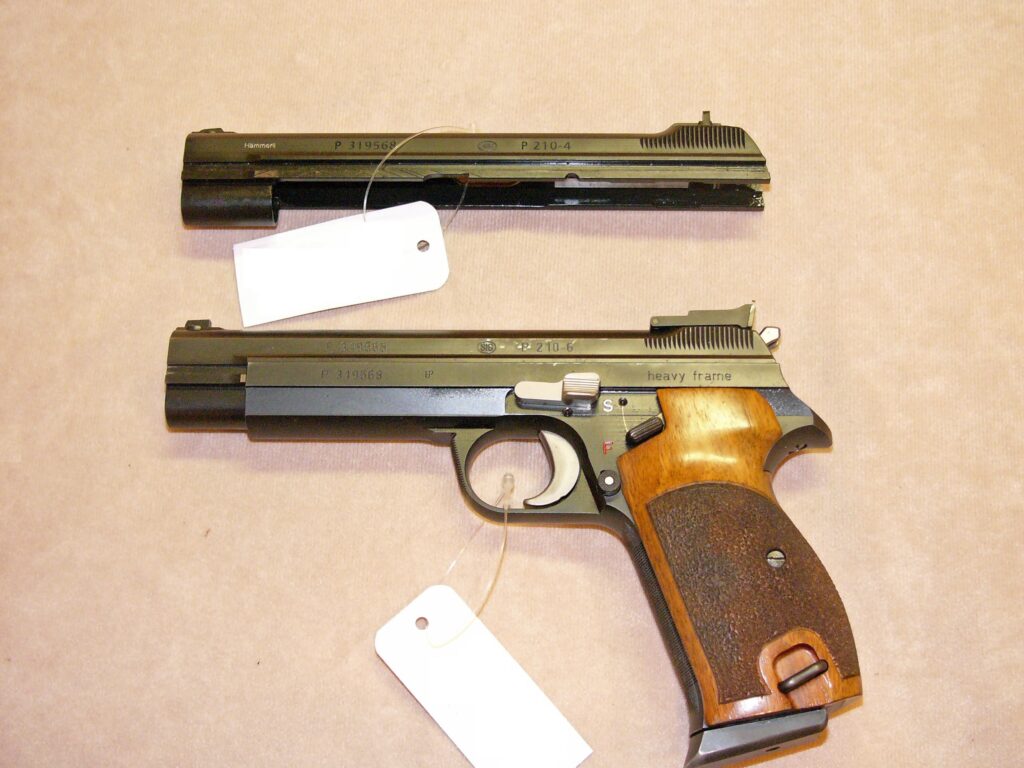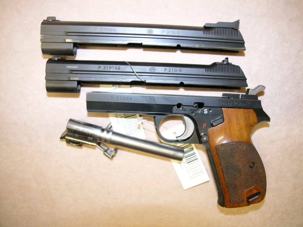 mit zweitem nummerngleichem Schlitten (P 2104-4) mit militärischem starren Visier, Oschatz-Umbau mit obenliegendem Magazinknopf und Checkering an Griffstückvorderseite und Abzugsbügel, Magazin mit Aluschuh, punzierte Griffschalen aus Nussbaumholz …… noch in allerhöchster Präzision und Feinarbeit gefertigt……….