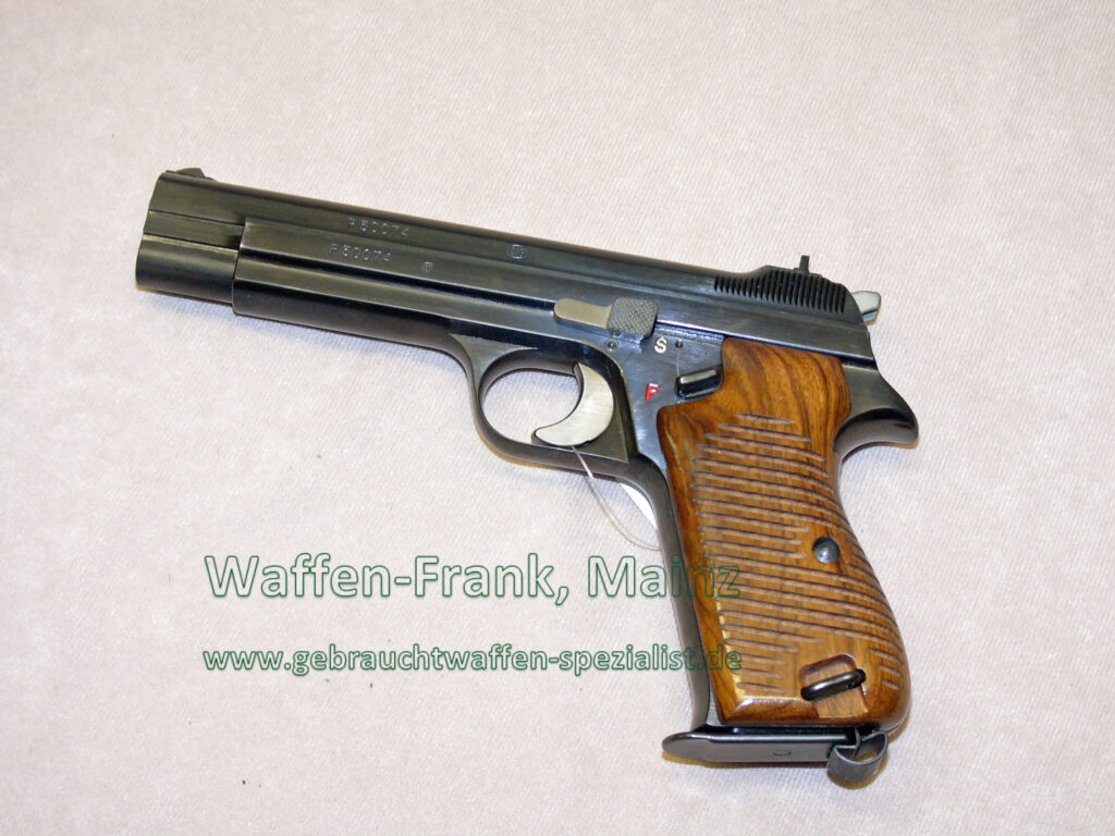 ungeschossen aus Sammlungsauflösung, die erste Ausführung der weltberühmten legendären Pistole P 210, hochwertigste Verarbeitung in feinster Handarbeit, starre Visierung, Griffschalen aus ausgesuchtem Nussbaumholz, ……. im Originalkarton und Holzaufbewahrungsschatulle mit interessanten Belegunterlagen………