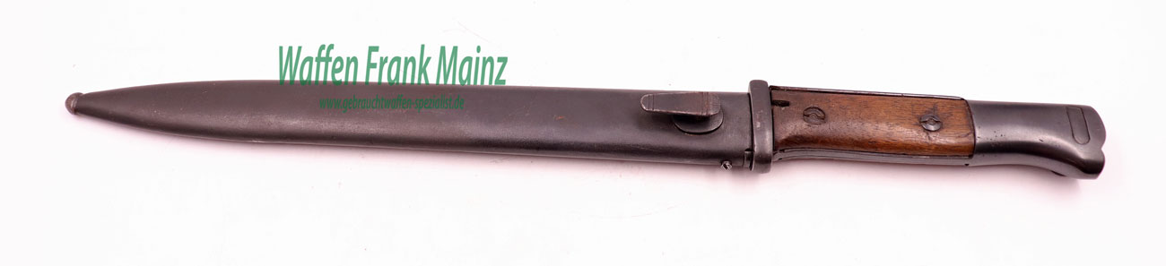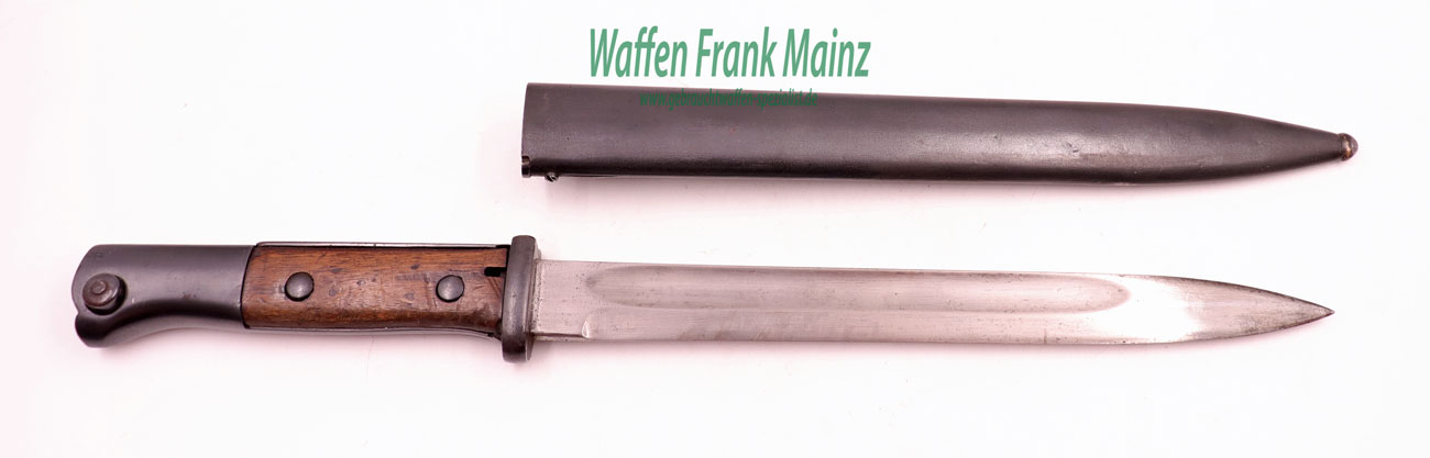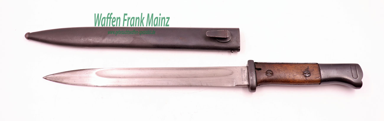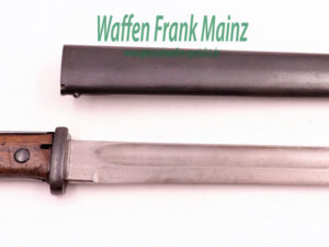 Originalzustand, nicht überarbeitet, Klinge blank, übrige Stahlteile brüniert, Holzbeschalung mit Gebrauchsspuren, jedoch ohne Rissbildung