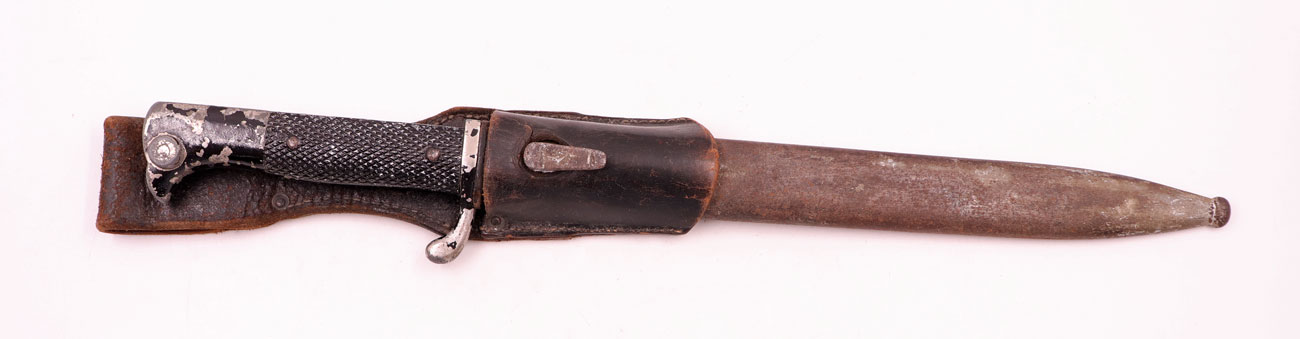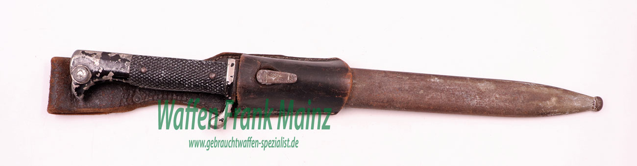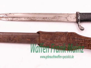 privates Ausgehbajonett, Klinge wackelt, müsste neu geklebt oder befestigt werden, mit Restaurierungspotenzial an Leder- und Stahlteilen….auch so als historisches Dekostück geeignet…ab 18 Jahren