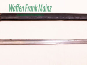 durchgehende Blutrinne, Klinge mit Spitze nach Jelmann Art, mit leichter, nicht überschliffener Narbenbildung, Originalzustand, nicht überarbeitet, mit viel Restaurierungspotenzial, mit sichtbarer Militärabnahme, gepechte Lederscheide mit Metallabschluss,