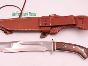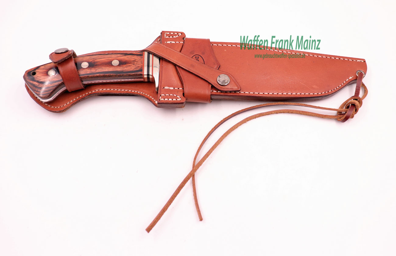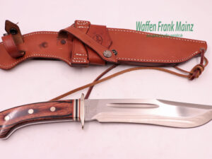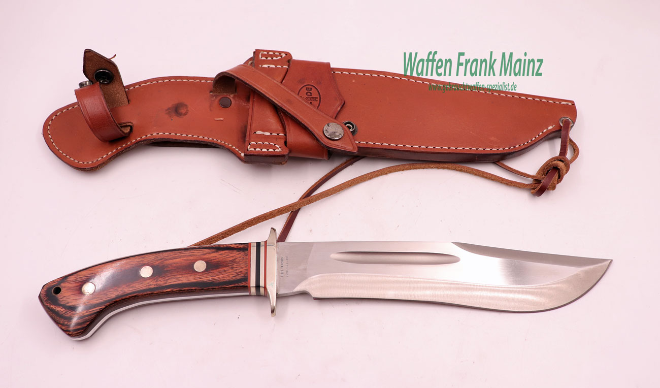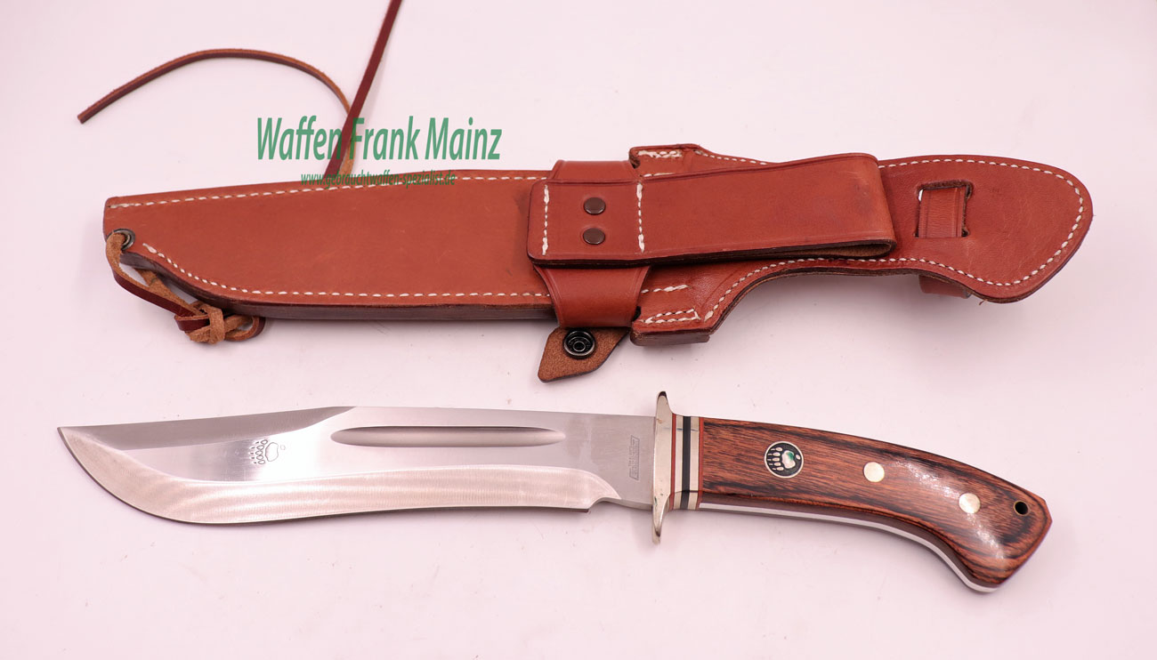 unbenutzt, aus Sammlungsauflösung, mit schwerer Bowie-Jagdklinge, Rückenbreite 6,5mm, Parierstange mit Ziereinlage und dreifach genieteten Schichtholzgriffplatten, mit Messinghülse für Fangriemen und eingelegtem Firmenlogo, fachlich durchdachte Lederscheide mit abnehmbarem Koppelteil und Fußriemen….interessant für den Sammler und jagdlicher Hundeführer….
