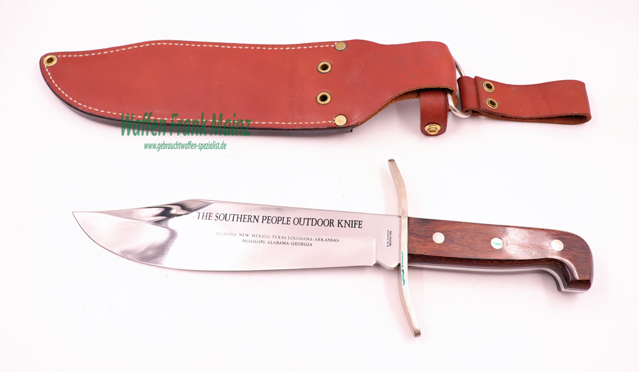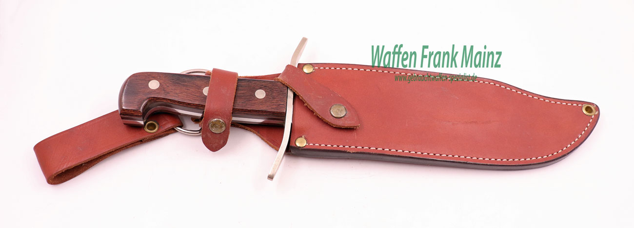 unbenutzt, aus Sammlungsauflösung, aus limitierter Herbertz-Sonderserie, mit entsprechedner Klingenbeschriftung, mit schwerer Bowie-Jagdklinge, Rückenbreite 5mm, starke Parierstange versilbert, mit Ziereinlage und dreifach genieteten Schichtholzgriffplatten, fachlich durchdachte Lederscheide mit doppeltem Sicherheitsriemen, mit beweglichem Zwischenring, um ein angenehmes Tragen uns Sitzen zu gewährleisten….interessant für den Sammler….