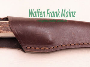 moderne Jagdnickerform, mit Integralklinge, neue Silberbacken, gute gemaserte Hirschhornbeschalung, Klinge 4,7x25mm, mit einseitigem Schliff an der Spitze zulaufend, in Leder Gürtel-Steckscheide