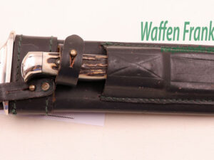 die Krone der Puma Jagdkollektion, als Waidbesteck mit nummerngleichem Waidblatt und Nicker, mit grüner Lederscheide (Zustand 2-3), noch in Original Holzbox mit Informationsbroschüre, gebaut nach Entwurf und Design von Oberforstmeister Walter Frevert aus der Mitte des letzten Jahrhunderts, noch in alter Formgebung und Ausführung, Klingen unbenutzt, noch mit voller Beschriftung und Härteprüfpunkte, Klingen aus Spezialstahl 55-57HRC, mit Härteprüfung 1.4116, feine Hirschhornbeschalung mit eingelassener Monogrammplatte aus 800er Silber