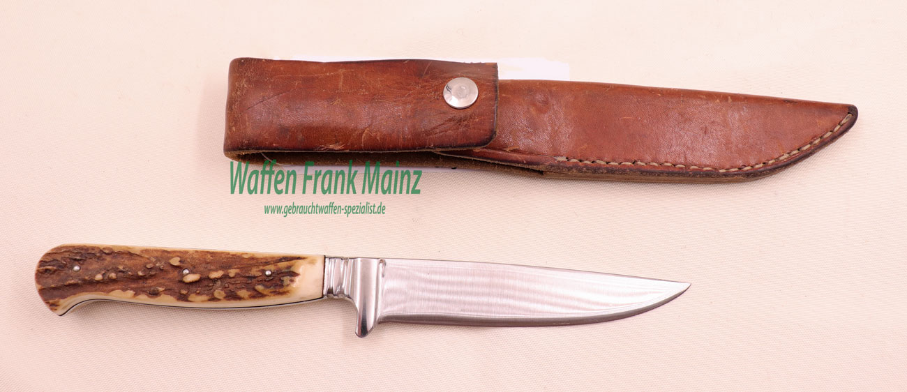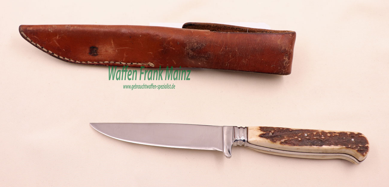 gut ausbalancierter Gebrauchsnicker, mit durchgehender Integralklinge 4,8x24mm, Hirschhorn beschalt, in Leder Steckscheide mit Knopflasche