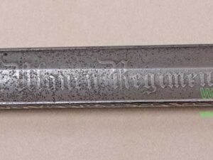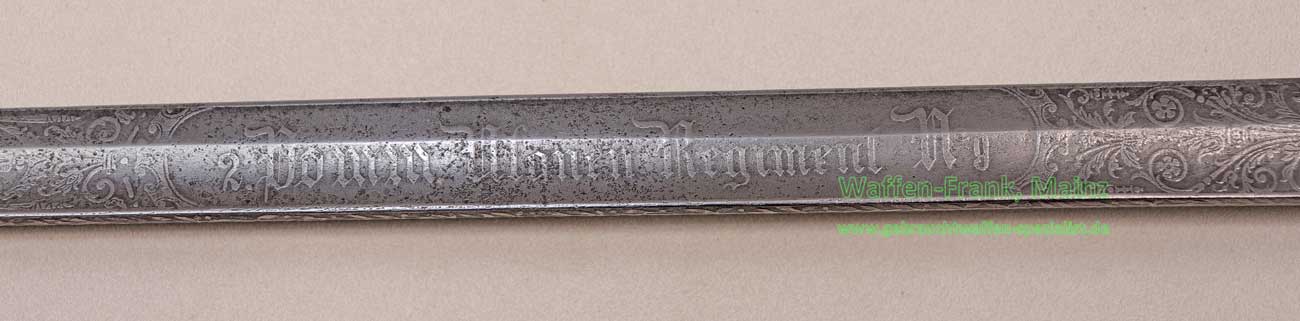 Preußen Kavallerie „Extradegen M89“, Standardausführung, gerade Klinge mit Hohlkehle, Mundblech defekt, Klinge und Scheide mit leichter Patina, ohne Herstellerzeichen, vernickelt und beidseitig geätzt, auf einer Seite „2.Pommersche Ulanenregiment Nr.9“, Regimentsgeschichte hier: http://www.demminer-ulanen.de/dokumente/regimentsgeschichte.html, 90 Stück davon wurden auch kolonial „Deutsch Südwest/Namibia“ im Dienst verwendet, vernickeltes Gefäß mit Klappscharnier, schwarzer Griff …RARITÄT