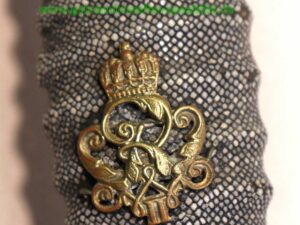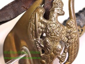 Originalzustand, nicht überarbeitet, aus langjährigem Familienbesitz, Offiziersausführung wilhelminisch-II, Klinge mit voller Beschriftung und Herstellerstempel im Bereich der Fehlschärfe, Klinge und Scheide werksverchromt, Mundblech der Scheide messingfarben, Griffbügelgefäß aus Messing mit eingegossenem Emblem des Reichsadlers sowie Messing-Emblem „von Wilhelm II.“ auf dem mit Rochenhaut bezogenem Stoß-Griff und aufgewickeltem Lederfangriemen …viel Restaurierungspotenzial vorhanden… …RARITÄT
