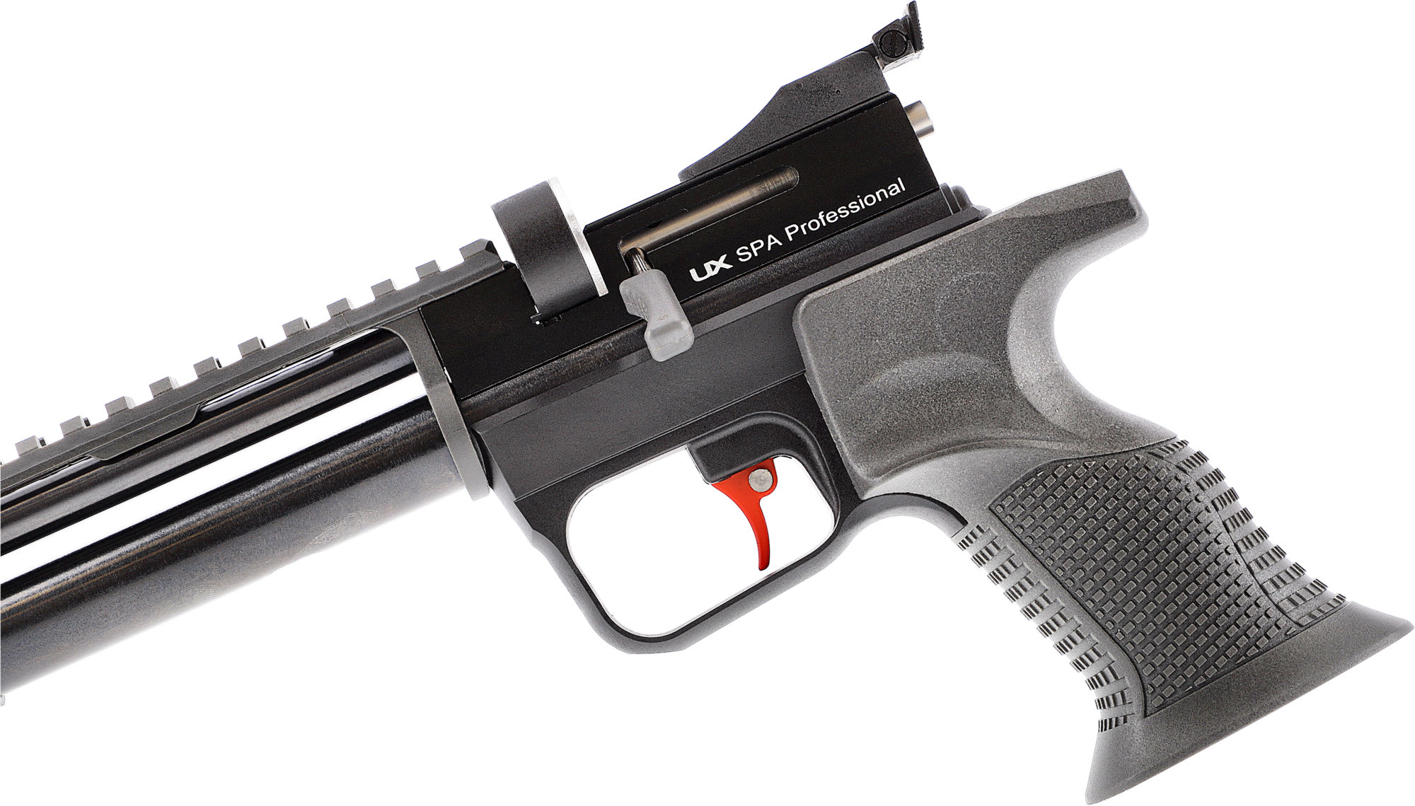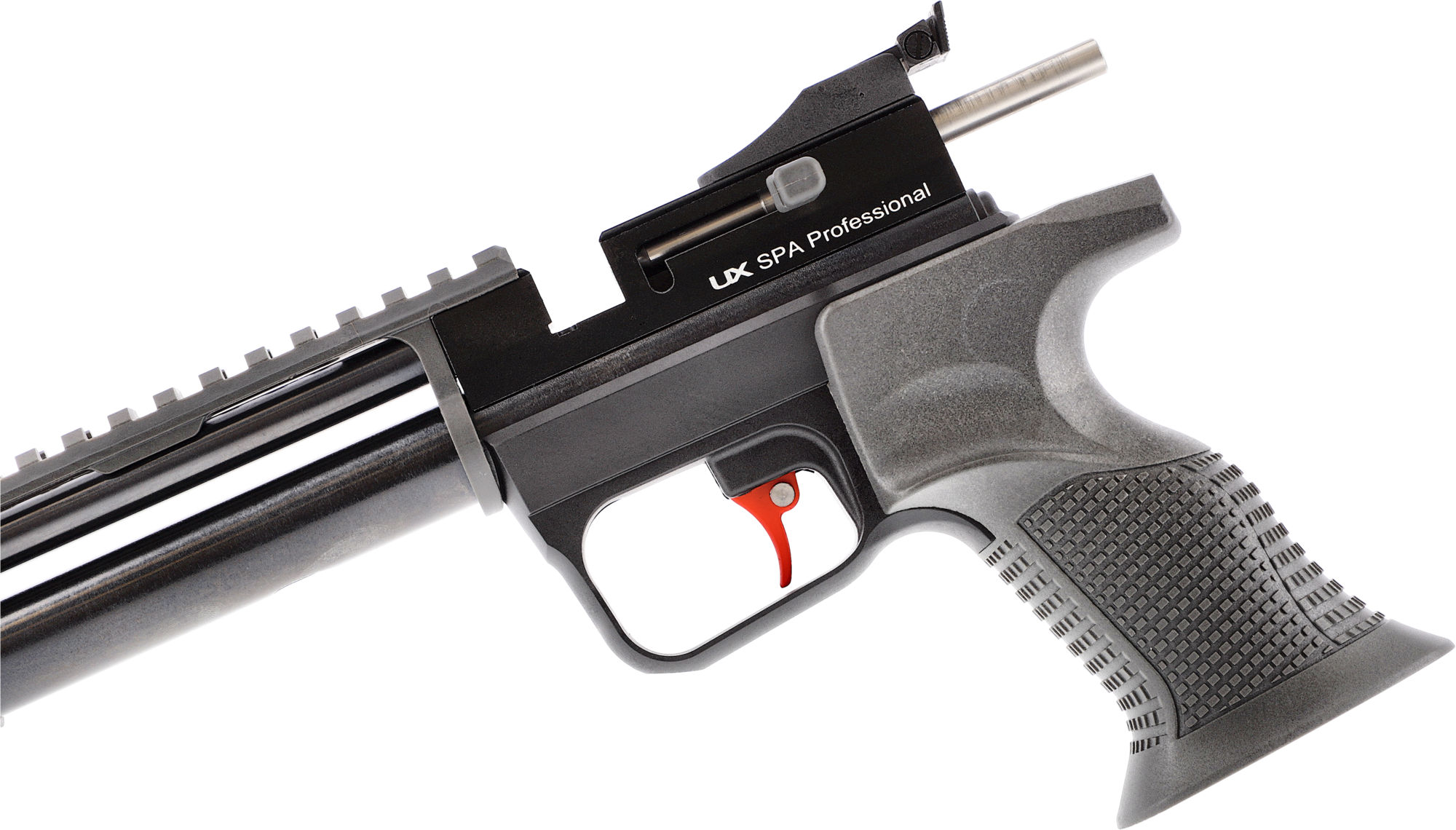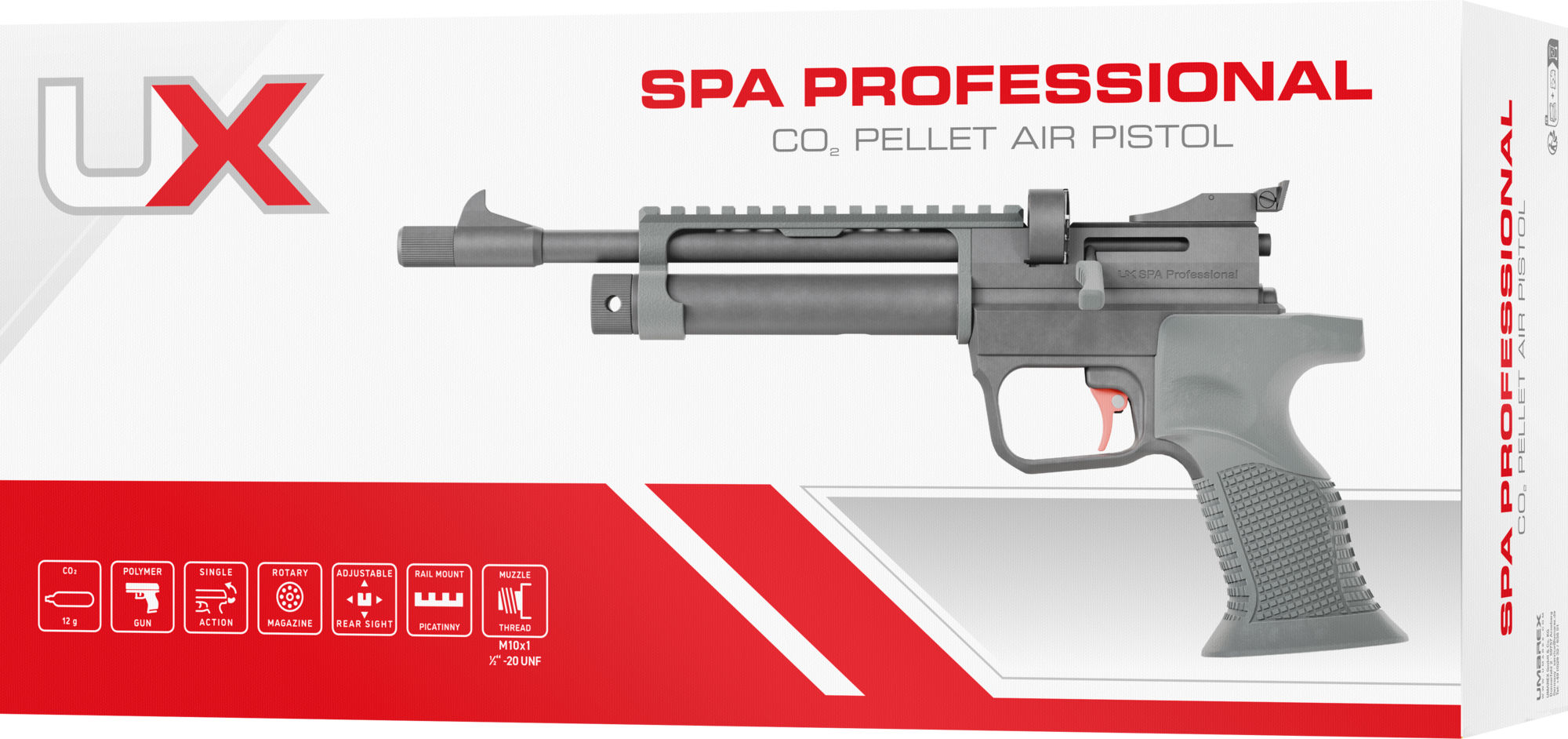Die sportlich konzipierte CO2-Pistole UX SPA Professional überzeugt mit ihrem hohen Potential für das anspruchsvolle Freizeitschießen. Der Single-Action Repetierer ist mit einem gezogenen Lauf und einem Trommelmagazin für Diabolos (Kal. 4,5 mm) ausgestattet, und der ergonomische Formgriff eignet sich gleichermaßen für Links- wie Rechtshänder. Der trocken stehende Sportabzug ist mit einem Metallzüngel ausgestattet. Eine Mikrometervisierung mit hinterschnittenem Scheibenkorn ist perfekt für alle Traditionalisten, und die Option, auch Optiken mit 11mm- oder Picatinny-Basis zu montieren, erweitert das Einsatzspektrum im Hinblick auf eine Rotpunktmontage. Wer lärmempfindliche Nachbarn hat, wird das Mündungsgewinde (M10x1) zu schätzen wissen, das sich per beiliegendem Adapter (1/2“-20 UNF) zur Montage eines Schalldämpfers nutzen lässt. Eine Einzelschuss-Lademulde ist ebenfalls im Lieferumfang enthalten.