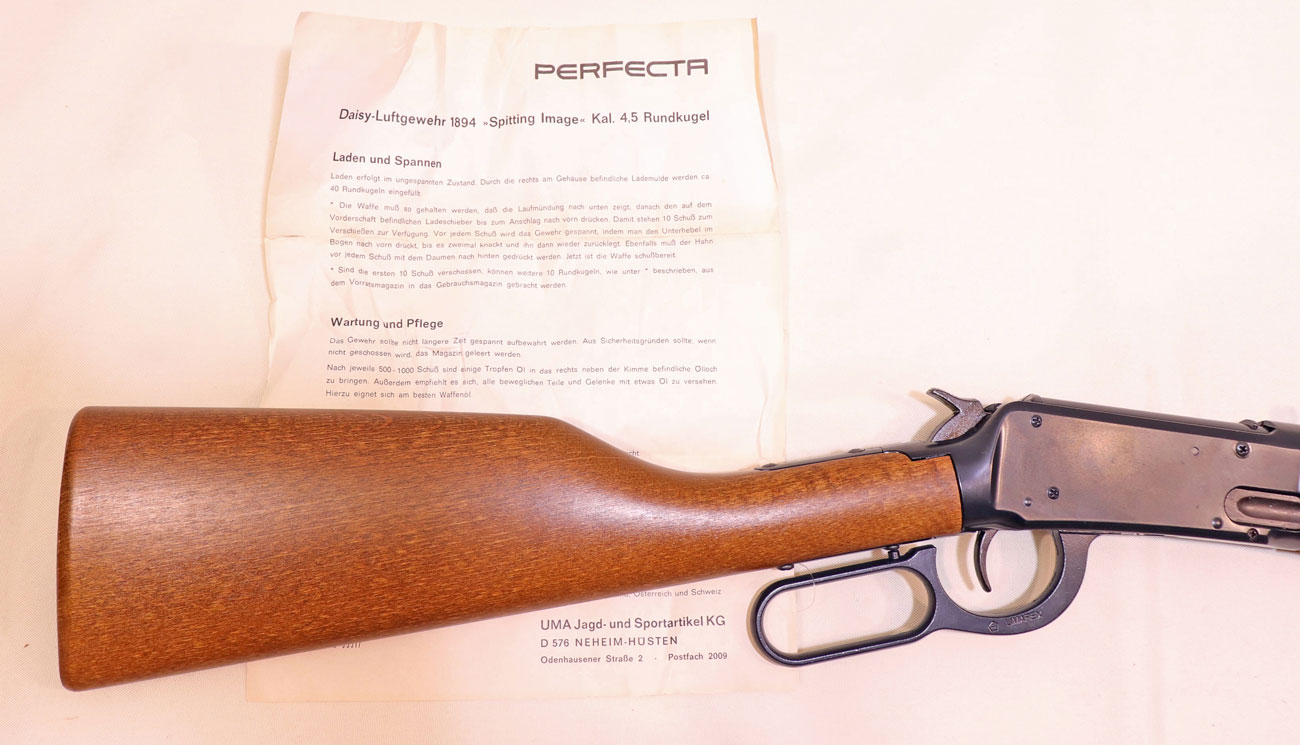 ungeschossen, aus Sammlungsauflösung, mit gültigem F-Zeichen, Import durch Umarex, Spannabzug, außenliegender Hahn mit 40 Schuss Magazinkapazität, Nachbau des wohl berühmtesten Westerngewehres von Winchester, in Design und Größe, mit neutralem Holzschaft, durch Betätigung des Unterhebelverschlusses wird das System jeweils für jeden Schuss gespannt, im Original Karton, noch frei ab 18 Jahren….werkstattgeprüft mit voller Funktion, Verkauf erfolgt als Sammlerwaffe ohne Garantie&Gewährleistung… ein echter Spaßmacher!