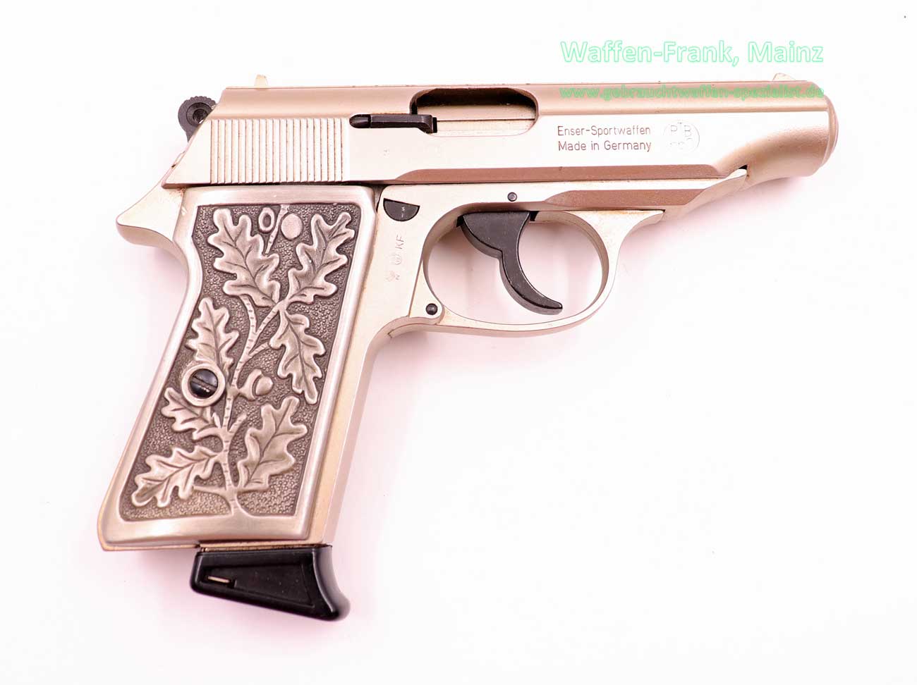 Aus Sammlungsauflösung. Die IWG P900 war der erste Nachbau der Walther PP und wurde von der nicht mehr existierenden Firma „Enser Sportwaffen“ produziert. Wie bebildert, noch frei ab 18 Jahren….werkstattgeprüft mit voller Funktion, Verkauf erfolgt als Sammlerwaffe ohne Garantie & Gewährleistung