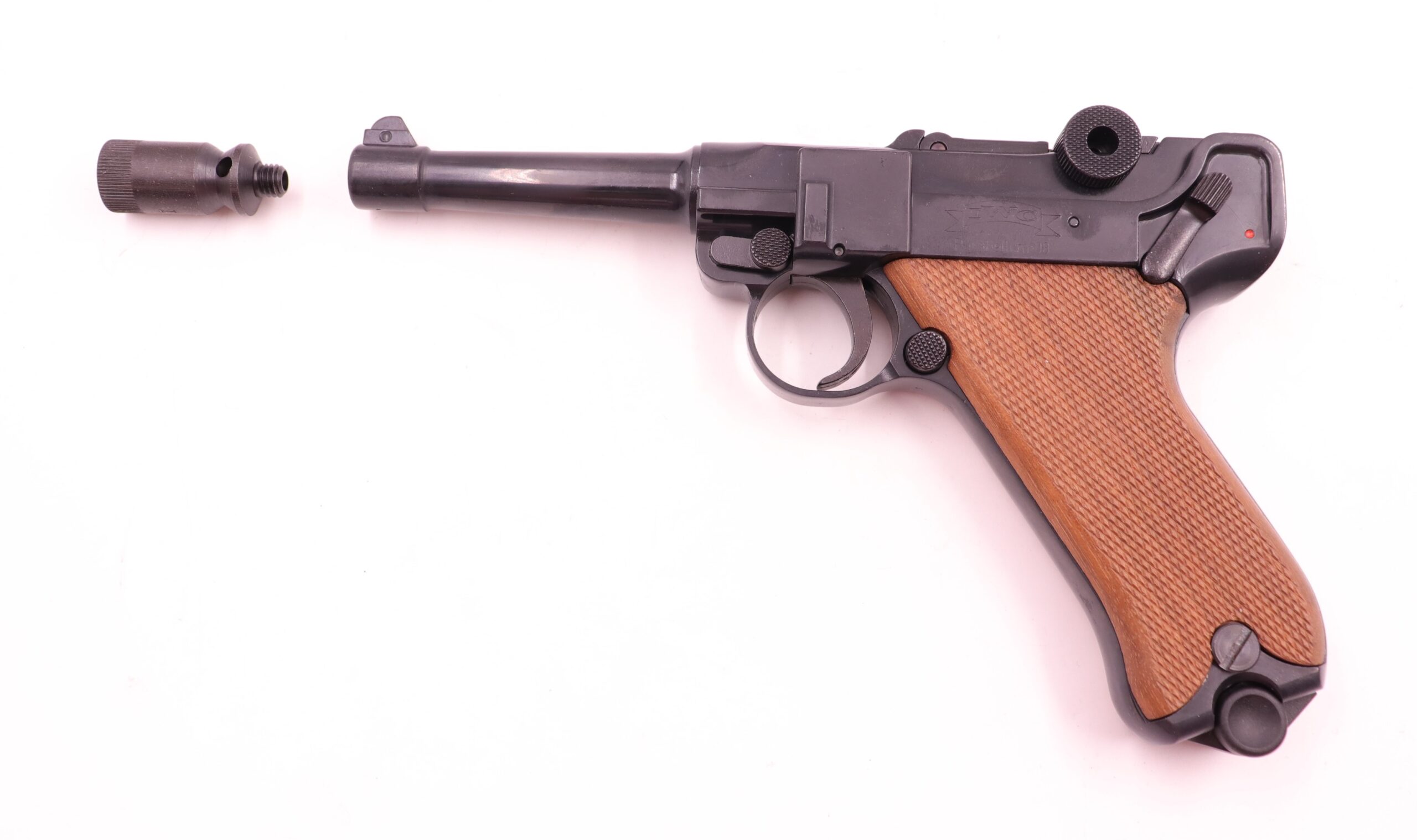 ungeschossen, aus Sammlungsauflösung, perfekter Nachbau der berühmten deutschen Wehrmachtspistole P08, in Größe, Gewicht und Funktion (Kniegelenkverschluss), mit herausnehmbarem Stainless Stahlmagazin 5+1 Schuss, Holzgriffschalen, im Kunststoffkoffer mit Zubehör, wie bebildert, noch frei ab 18 Jahren….werkstattgeprüft mit voller Funktion, Verkauf erfolgt als Sammlerwaffe ohne Garantie&Gewährleistung
