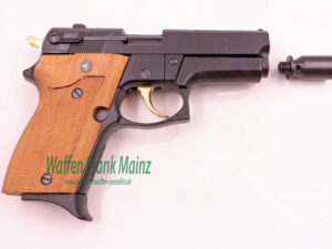 aus Sammlungsauflösung, aus kleinster, limitierter Sonderserie „80 Jahre ME/1911-1991“, mit zweistelliger Seriennummer, Hahn und Abzug vergoldet, mit Holzgriffschalen und eingelegten, silberfarbenen Firmenbemblem, mit Zertifikat, perfekter Nachbau der S&W Behördenpistole M659, mit herausnehmbarem 7+1 Schuss Stahlmagazin, in Original Eiche-Holzkassette mit Zubehör, wie bebildert, noch frei ab 18 Jahren….werkstattgeprüft mit voller Funktion, Verkauf erfolgt als Sammlerwaffe ohne Garantie&Gewährleistung