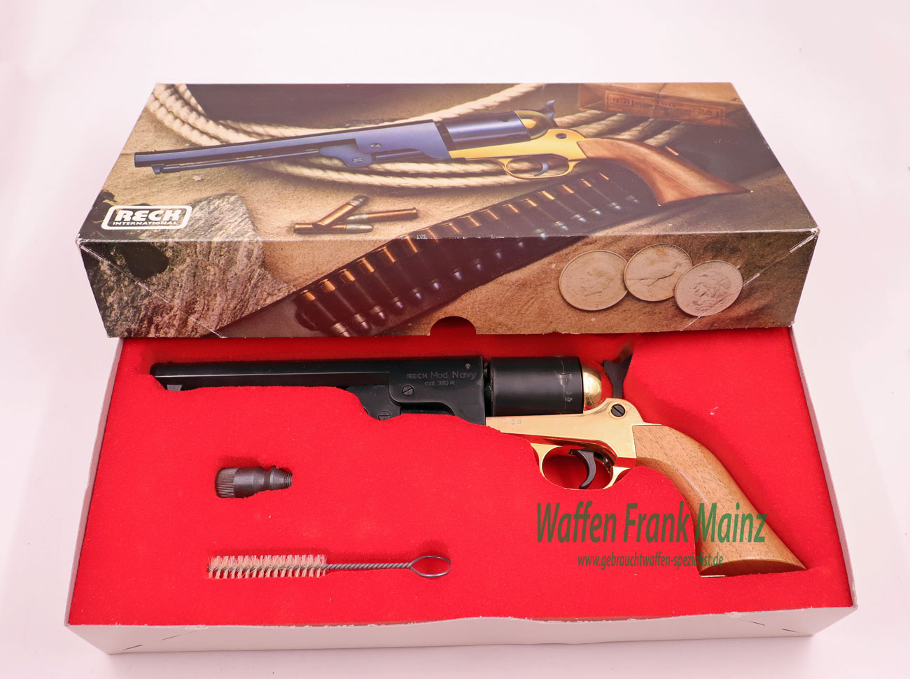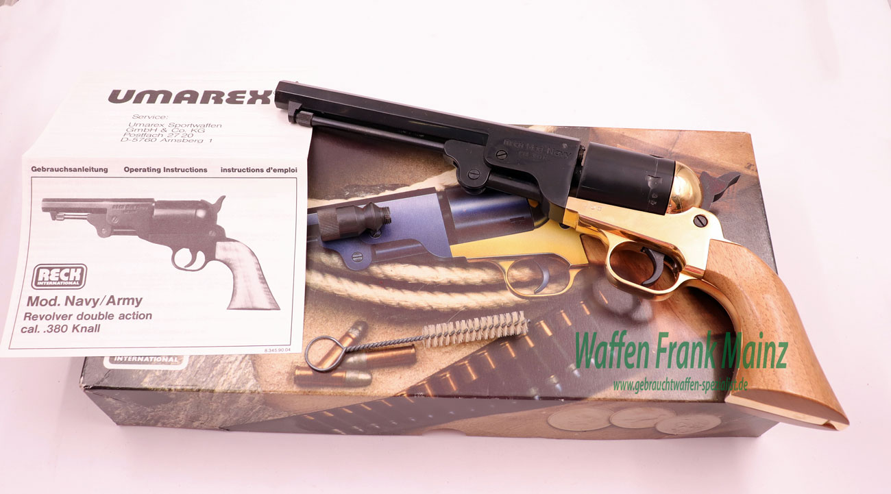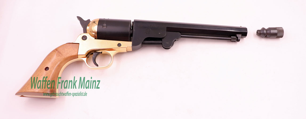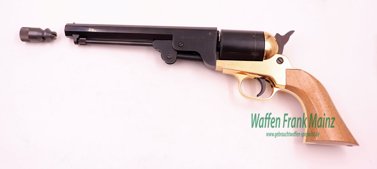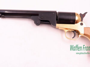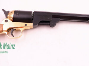 aus Sammlungsauflösung, klassischer Nachbau des berühmten Colt Westernrevolvers Mod. 1851 Navy mit offener Rahmenbrücke, mit klassischem SA-Abzug, 6-schüssige Stahltrommel, klassischer Achtkantlauf mit darunterliegendem, abnehbarem Ausstoßerstift, Holzgriffschalen mit vergoldetem Griffstück, im Original Karton mit Zubehör, wie bebildert, noch frei ab 18 Jahren….werkstattgeprüft mit voller Funktion, Verkauf erfolgt als Sammlerwaffe ohne Garantie&Gewährleistung