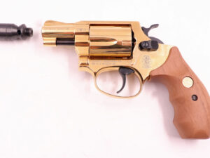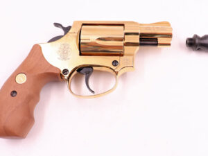ungeschossen, aus Sammlungsauflösung, perfekte Lizenzfertigung des berühmten S&W Taschenrevolvers in hochwertigem 24 Karat Gold Finish, Holzgriffschalen mit eingelassenem, goldfarbenem Firmenemblem, mit passendem Ledergürtelholster mit Metallclip, in Original Kunststoffkoffer und Zubehör, wie bebildert, noch frei ab 18 Jahren….