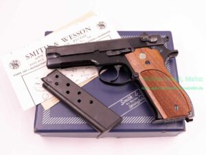 ungeschossen, aus Sammlungsauflösung, noch in Original blauer Pappschachtel mit Ersatzmagazin und Bedienungsanleitung, leichte, führige DA-Pistole, mit Duralgriffstück, seitlich, verstellbare Visierung, neutrale braune Nussbaumgriffschalen mit eingelegtem Firmenemblem, 8+1 Schuss Stahlmagazin….die perfekte Pistole für Jagd und Selbstschutz, führig und trotzdem leistungsstark….(passende Schrotpatronen und moderne Teilmantelgeschosse ab Lager)