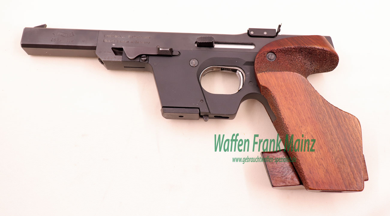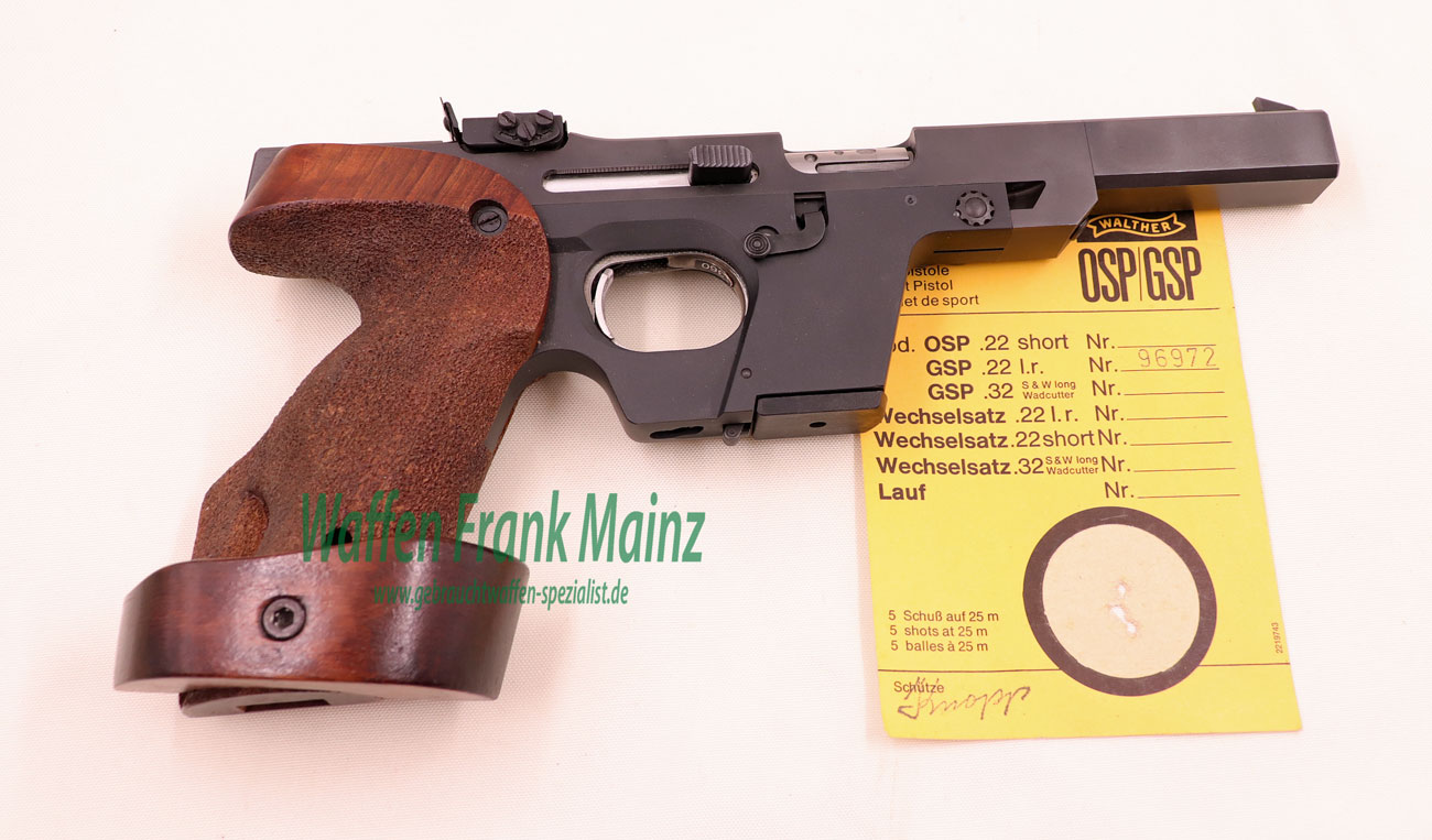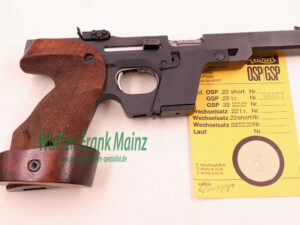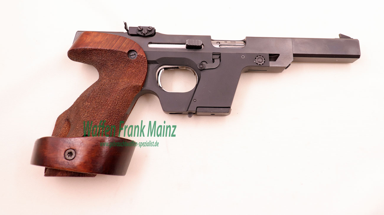 selten geschossene Schrankwaffe, bereits mit neuem, mehrfach verstellbarem Abzug und großem Magazinschacht für Wechselsystem in Kal. .32 S&W long WC und automatischer Schlittenfang, Original verstellbare Rechtsgriffschalen Gr. S-L, mit ausgesuchtem Werksschussbild und Bedienungsanleitung…..