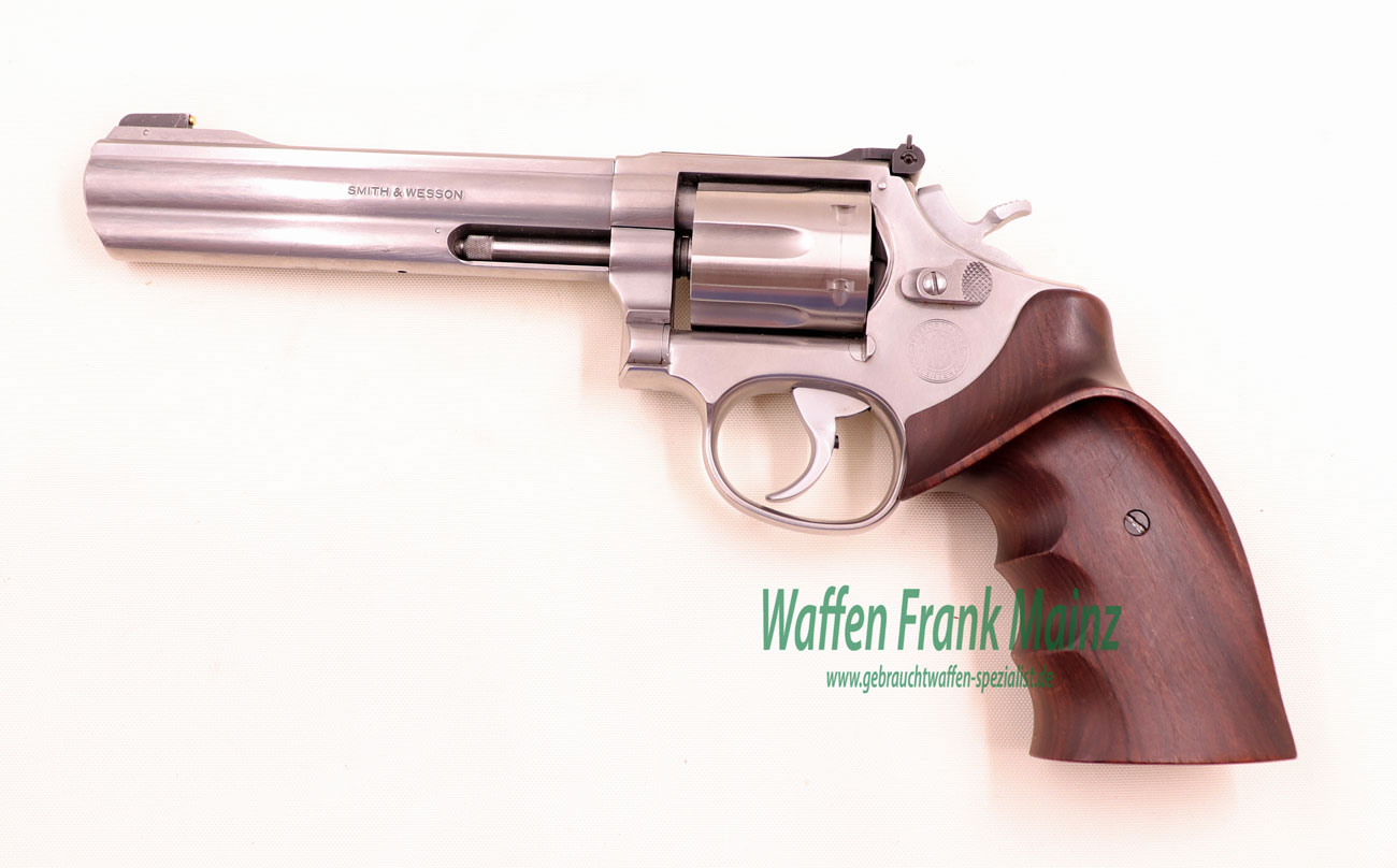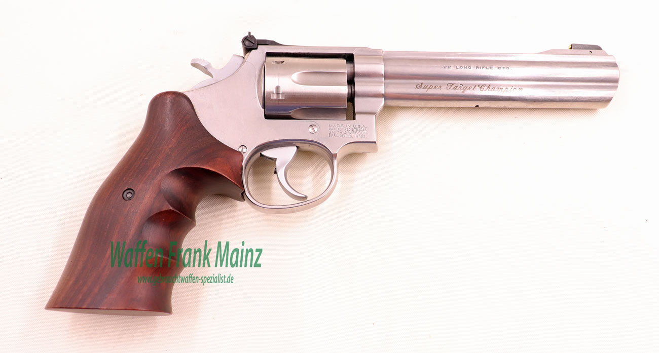 selten geschossene Schrankwaffe, als Sonderserie gefertigt im S&W Performance Center, mit handgetunter Trommel und Schloßgang, Triggerstop, matt vernickelter, breiter Targetabzug und Hahn, sportliches Kontrastvisier, mit Original Nill Nussbaumgriffschalen für Rechtsschützen mit Daumenauflage….wohl einer der besten Matchrevolver in Kal. .22 am Markt…..