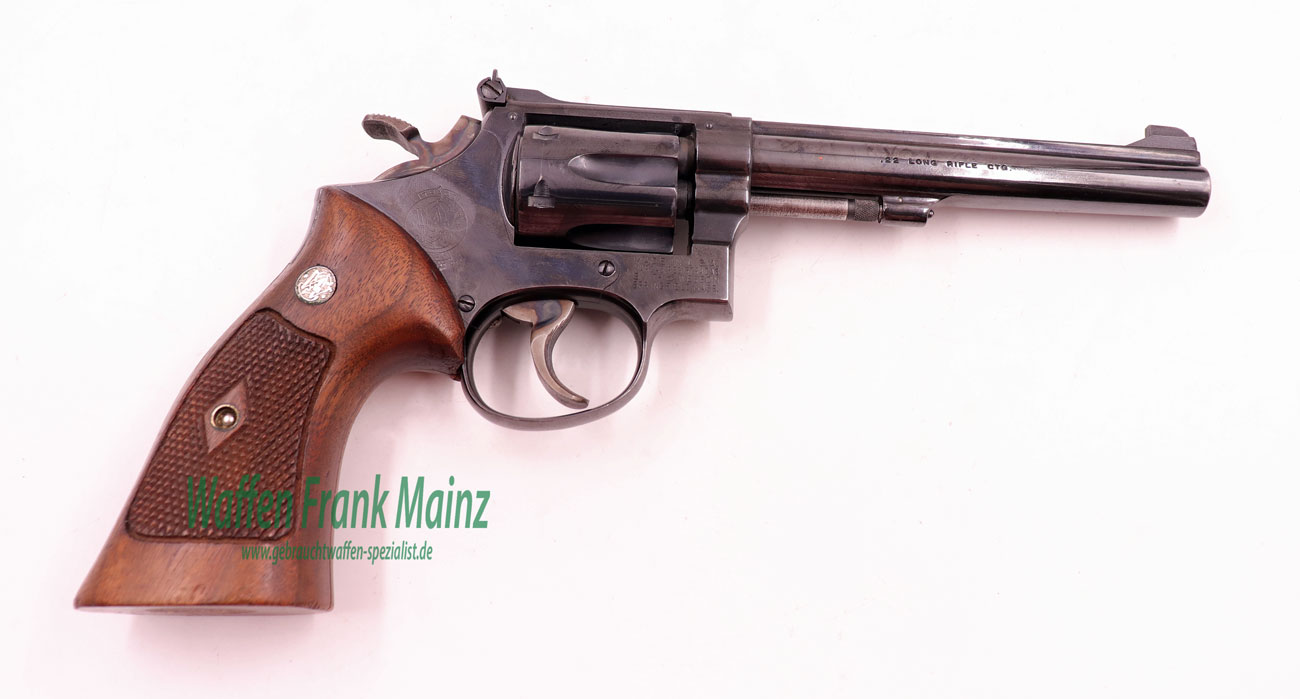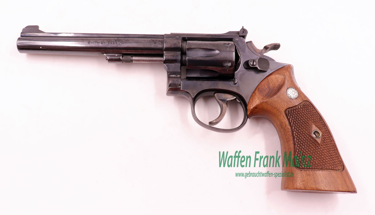 selten geschossene , gut gepflegte Schrankwaffe, noch in hochwertiger Verarbeitung, mit perfektem Trommel- und Abzugstiming, Abzug und Hahn in verbreiterter Targetausführung mit Bunthärtung, original, neutrale S&W Target Griffschalen, mit beidseitig eingelegtem, silberfarbenem Firmenemblem…..lange Zeit als bester Matchrevolver in .22lr weltweit mit bestem Rekord- und Medaillenerfolg bis heute geschossen…..