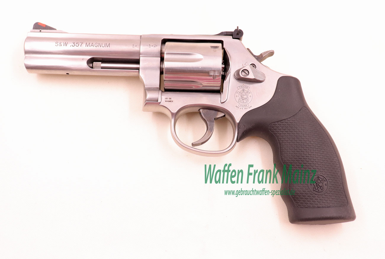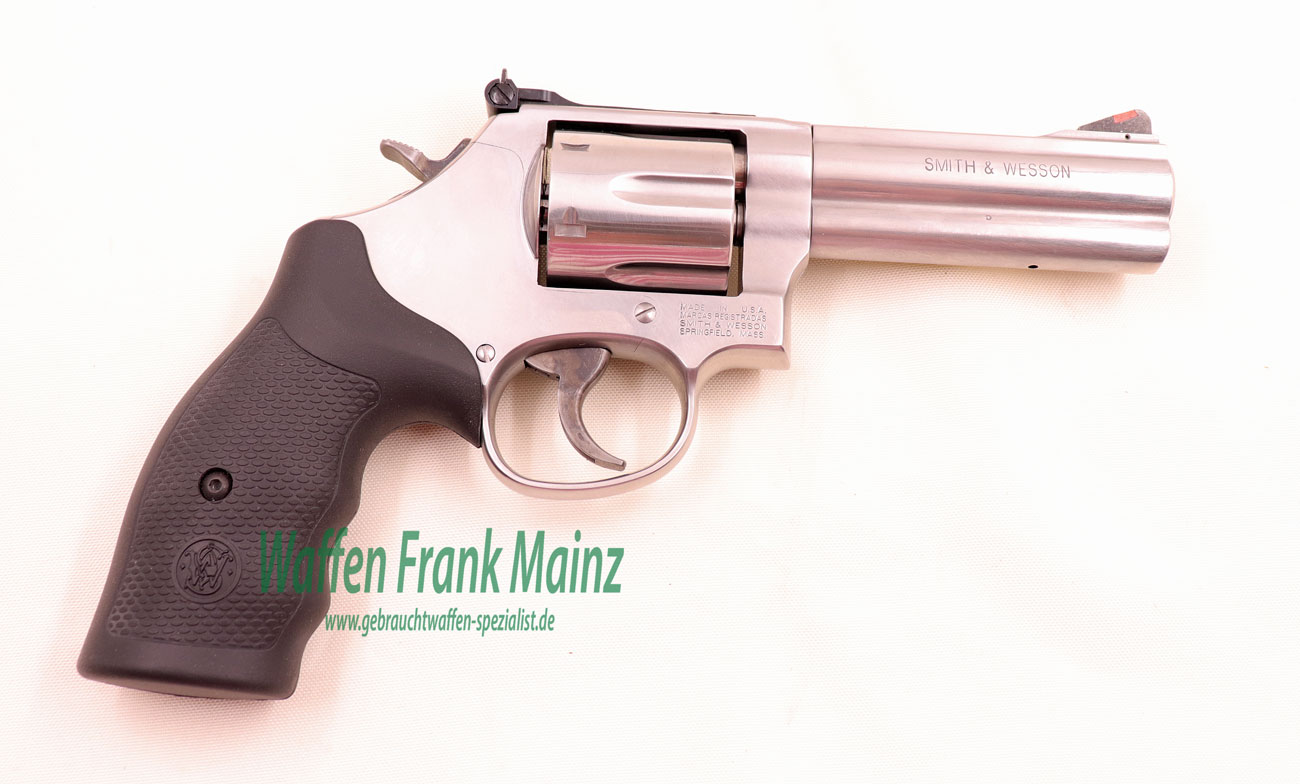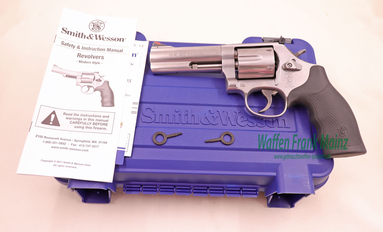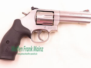ungeschossen, aus Sammlungsauflösung, noch im Originalkoffer mit bebildertem Zubehör, 6-schüssige Stainless DA-Ausführung, Abzug und Hahn bunt gehärtet, verstellbares Kontrastvisier mit Original neutralen S&W schwarze Gummigriffschalen, Waffe mit abschließbarer Schloßblockierung….Universallauflänge für Jagd und Sport….