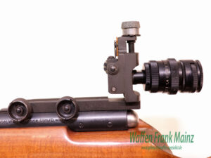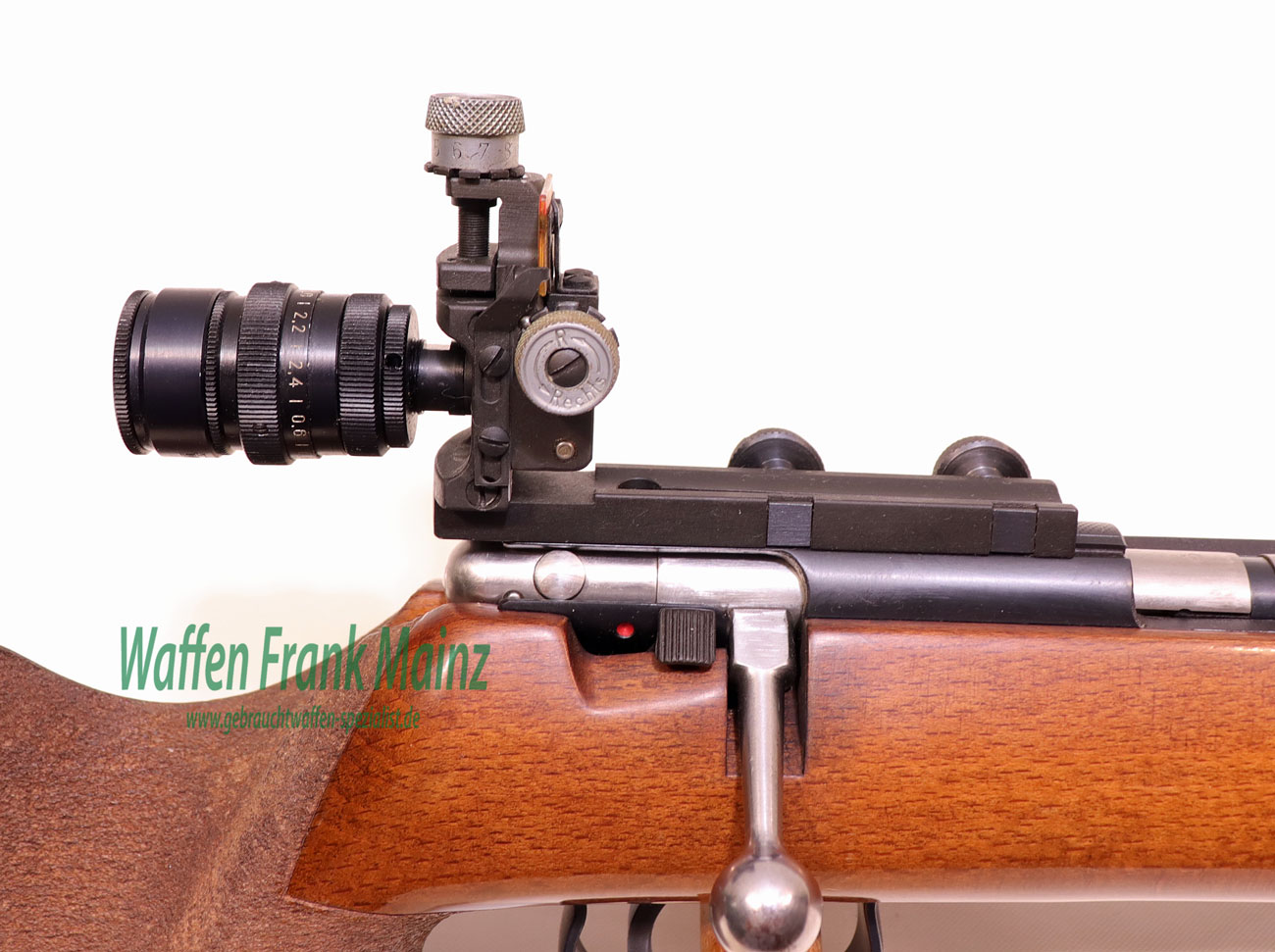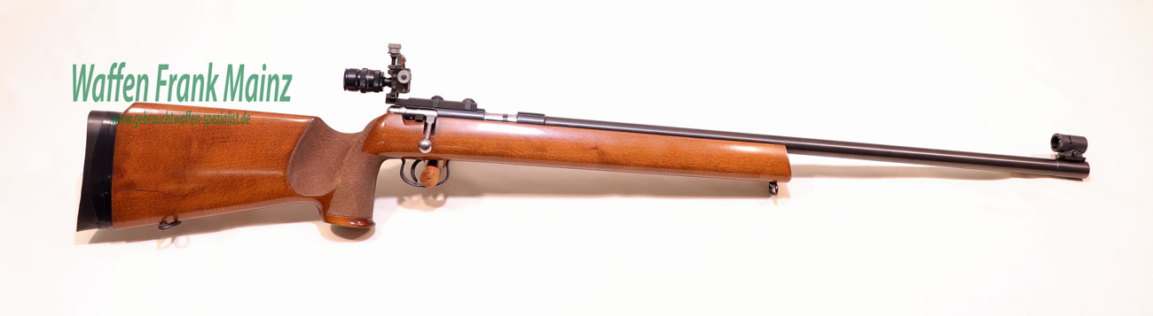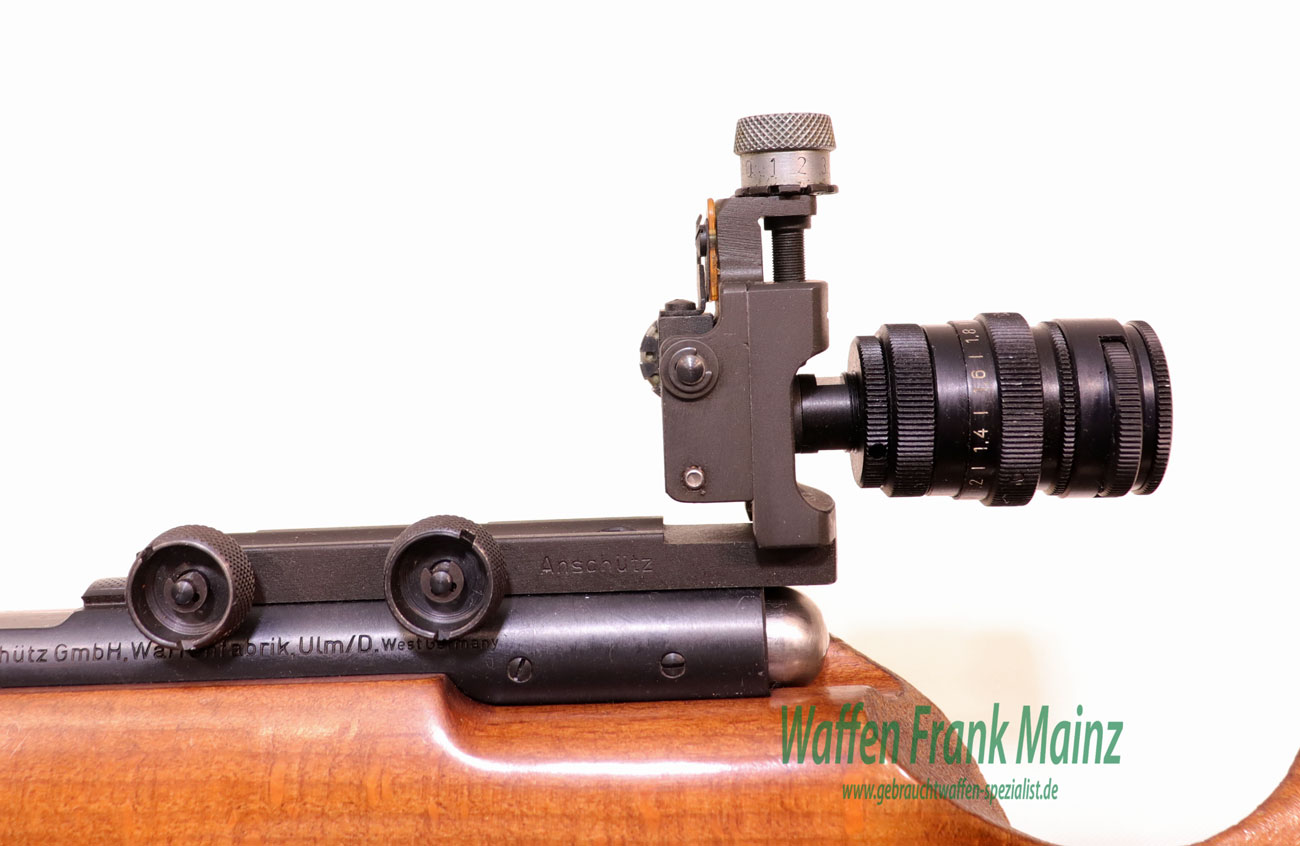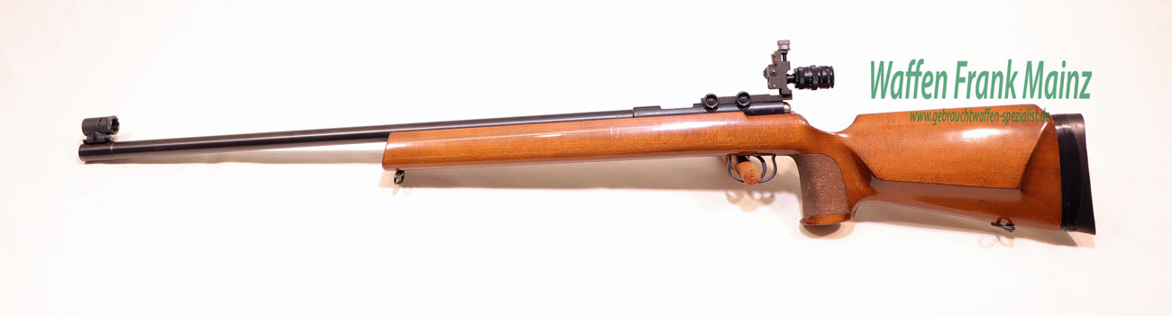 selten geschossene Schrankwaffe, in Junior-Ausführung, mit spiegelblankem, selten geschossenen 20mm Matchlauf, verstellbarer Feinabzug, komplette Anschütz Dioptermontage mit hochwertiger, verstellbarer Anschütz Diopterblende von 0,6-2,4mm und 5-fachem Farbfilter, Universalschaft mit Backe für Rechtsschützen, verstellbare Schaftkappe, Prismenschiene unterm Vorderschaft für Schießriemenaufnahme und zusätzlichen Riemenbügel