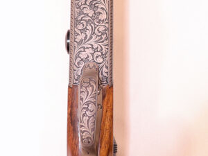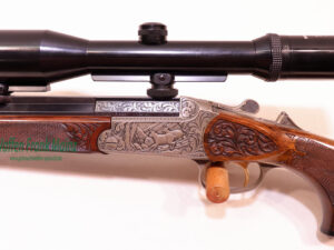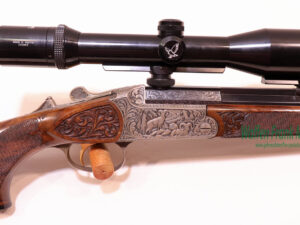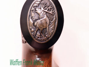 Schrankwaffe (nur auf wenigen Auslandsjagden geführt), heutiges Nachfolgemodell K95 Baronesse, mit verstellbarem, vergoldetem Feinabzug, patentierter Blockverschluss und Handspanner-Sicherheitssystem, Achtkantlauf rund auslaufend, mit perfekter Schussleistung (Munitionsauswahl ab Lager), Blaser Schwenkmontage mit ZF Swarovski Nova 2,2-9×42 Absehen 4, mit patentiertem, federndem Okularstutzen, hochwertige tiefgestochene Reliefgravur (Tierstücke modeliert links Gams- rechts Mufflonmotiv) durch den meisterlichen Spitzengraveur R. Kaufmann nach Vorgaben des Vorbesitzers, flächendeckende, tiefgestochene Blattarabeskengravur auf grau gebeiztem System, Bedienteile, Laufwurzel, Kornsockel und Schienenabsatz, im Pistolengriff eingelegte Silberplatte mit Rothirsch, klassische Schäftung mit langezogener, bayrischer Backe mit Doppelfalz, Vorderschaft mit Schnäuzchen, hochwertig gestochene Schaftverschneidung im Bereich der Schaftwangen und als Fischhauteinrahmung an Vorder- und Hinterschaft, Schaftlänge einschl. Gummikappe 365mm, aus hochwertigem Wurzelmaserholz Holzkasse 7-8…..eine ethische und führige Kipplaufbüchse mit perfektem Abzug- und Sicherheitssystem für schwieriges Gelände und weite Schüsse bis 300m auf alles europäische Hochwild…….