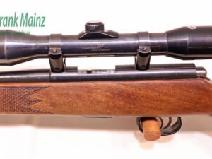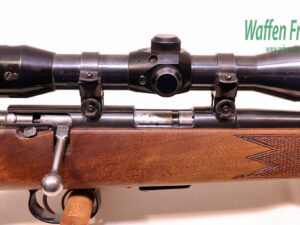 mit dem bewährten Kurvenspanner-Zylinderverschluss, Lauf spiegelblank, mit herausnehmbarem 4+1 Schuss Stahlmagazin, deutscher Stecher, mit abgedecktem Mündungsgewinde M12x1 für Schalldämpfer, Aufkippmontage mit Stahl-ZF Nickel 4×36 Absehen 4, ZF im Außenbereich leicht abgewetzt, Nussbaumschaft mit Backe für Rechtsschützen, mit Riemenbügel, Schaftlänge 360mm, mit jagdlichen Gebrauchsspuren…..perfekt für Kaninchen- und Raubzeugjagd….breite Munitionsauswahl ab Lager