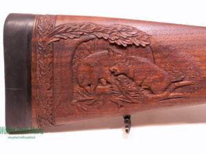 gut gepflegte Pirschbüchse, handgefertigt aus ausgesuchtem Mausersystem, Magazinkapazität 5+1 Schuss, mit guter Schloßgängigkeit, flachgeschmiedeter Kammerstengel, Kontrastvisier, deutscher Stecher, Montagefüße auf der Waffe noch vorhanden, jedoch Optik fehlt, Nussbaumschaft mit deutscher Backe für Rechtsschützen, Schaftlänge 370mm inkl. Gummikappe, nachträglich mit Schuppenfischhaut und Schaftverschneidung versehen……kurze führige Pirsch- und Nachsuchenwaffe…..(Abzug kann gegen Mehrkosten auf Direktabzug umgebaut werden)