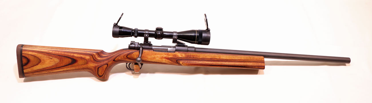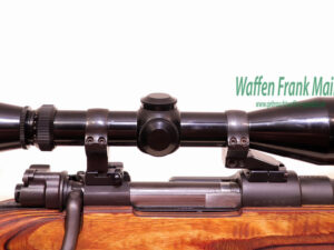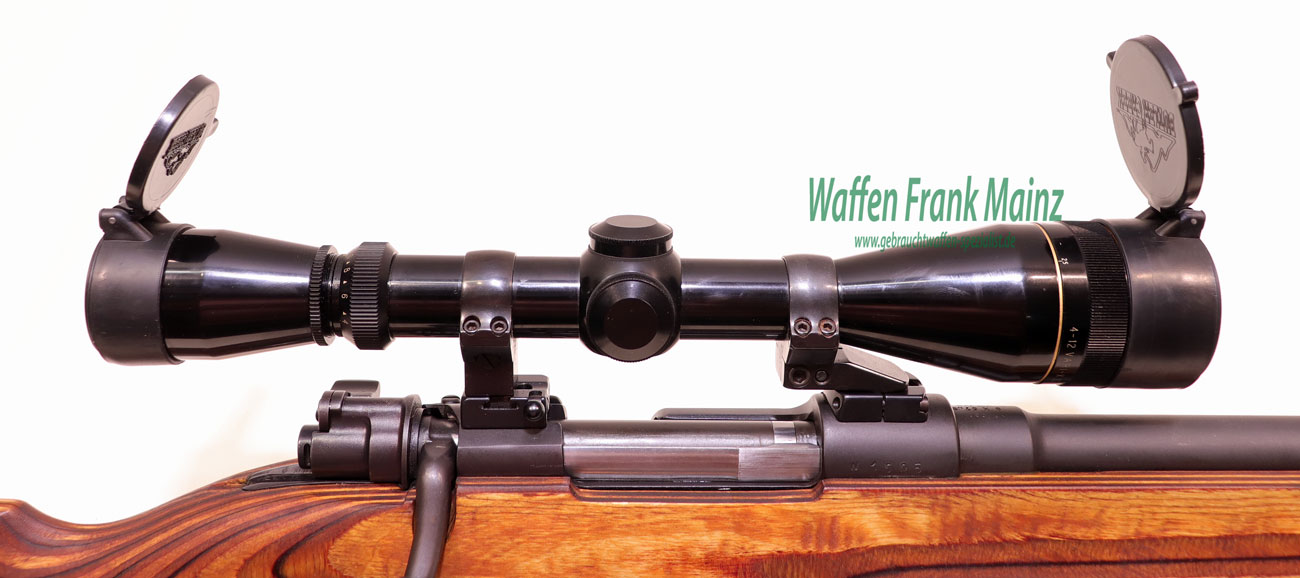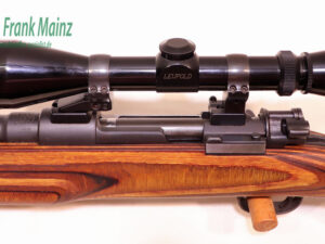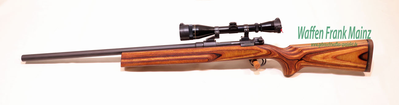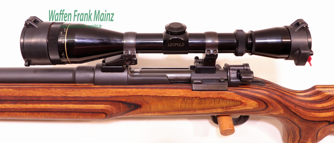 selten geschossen, aus Sammlungsauflösung, Büchsenmacher-Einzelanfertigung, mit ausgesuchtem Repetiersystem Typ Mauser 98, mit rundem Varmint-Matchlauf 22mm Durchmesser, mit Benchrest-Mündung, verstellbarer Feinabzug, Stahlteile matt brüniert, EAW-Magnum-Schwenkmontage mit ZF Leupold 4-12×42 Vari-X II mit 30/30 – Crosshair Absehen mit seperater Parallaxe Einstellung im Objektivbereich, neutraler Schichtholzschaft mit 60mm breiter Vorderschaftsauflage, Schaftlänge einschl. Gummikappe 370mm…..ein echter Lochbohrer für Sport und Jagd…