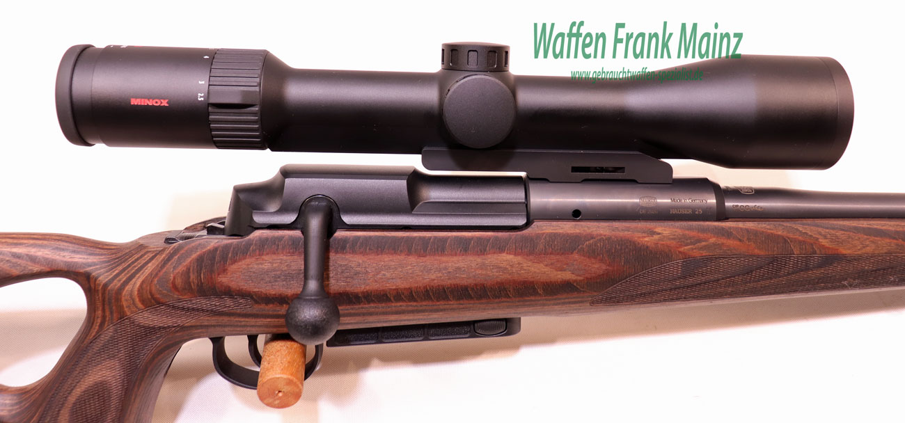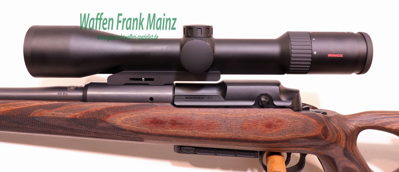 Die Mauser M25 Max ist ein Geradezugrepetierer, der sehr leichtgängig und schnell in der Bedienung ist, sowie mit großer Zuverlässigkeit und Präzision punkten kann. Der Buchen-Schichtholz-Lochschaft mit höhenverstellbarer Wangenauflage besticht duch eine sehr gute Ergonomie, sowie hohe Stabilität und Verzugssicherheit, selbst bei ungünstigsten Witterungsbedingungen. Der Kammerstängel sitzt direkt über dem Abzug für blitzschnelle Schußfolgen. Die Magazinkapazität beträgt serienmäßig 3+1 Schuß, ein Magazin mit erhöter Kapazität von 5+1Schuss kann zusätzlich erworben werden.