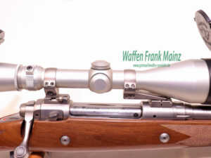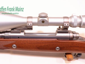 klassisches Dreiklappen Safarivisier, EAW- Schwenkmontage ebenfalls in Stainless, mit ZF Leupold Vari X III 3,5-10×50 Absehen 4, mit 3+1 Schuss Kastenmagazin, neutraler Safari Holzschaft mit zwei zusätzlichen Systemstollen, abnehmbare Riemenbügel in Stainless, Schaftlänge 360mm einschl. original Gummikappe…für den Liebhaber klassischer Großwildpatronen….(passende Munitionsauswahl ab Lager)…