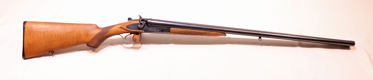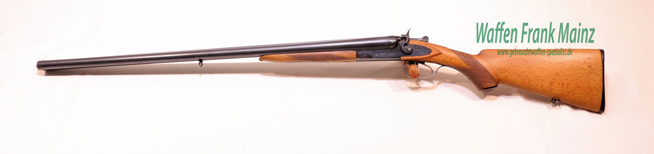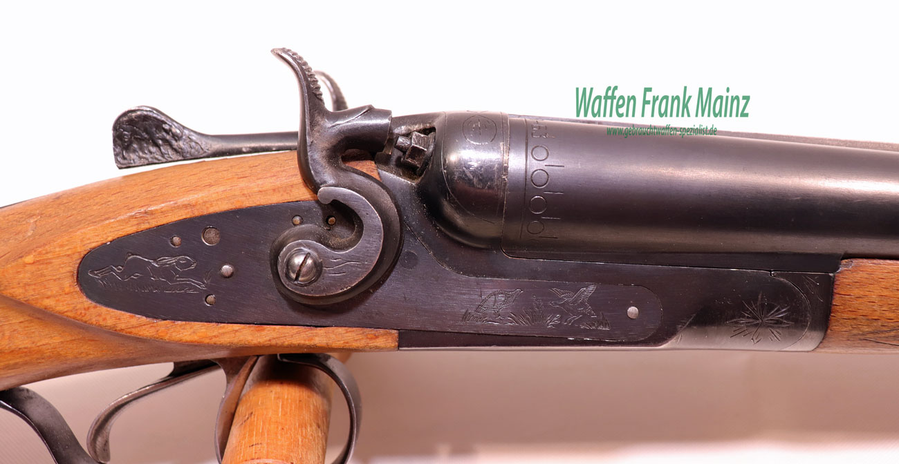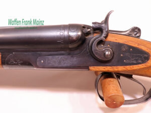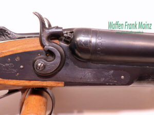 selten geschossene Schrankwaffe, mit außenliegenden Rückspringer-Hahnschlössern, Doppelabzug, Choke 1/2-1/1, neutraler Pistolengriffschaft, Schaftlänge 365mm, noch aus guter, alter Fertigungsqualität aus Stahl….für den Liebhaber von Hahnwaffen, sichere Flinte für Hundeführer und bei Nachsuche….