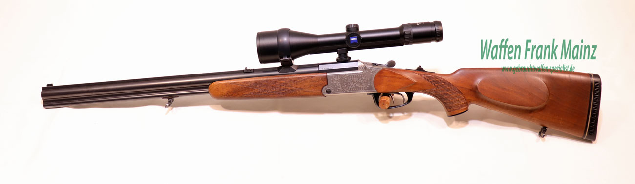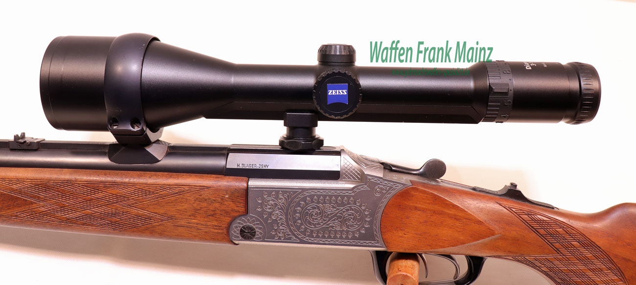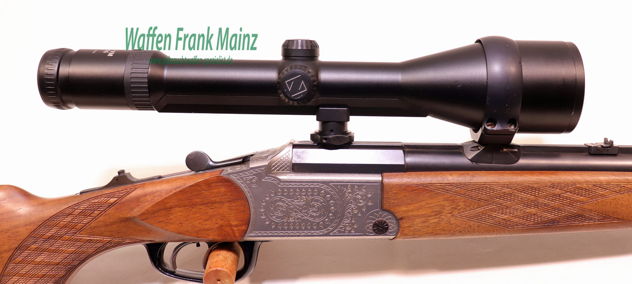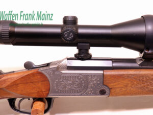 selten geschossene Schrankwaffe, mit dem patentierten Einschloss-Sicherheitshandspannersystem, zerlegbar, mit Schwenkmontage und ZF Zeiss Diavari VM 3-12×56 T* mit dimmbarem Leuchtabsehen, Nussbaumschaft mit deutscher Backe für Rechtsschützen, Schaftlänge einschl. Gummikappe 380mm….perfekte und sichere Universalwaffe für das ganze Jagdjahr mit bekannter guter Schussleistung….