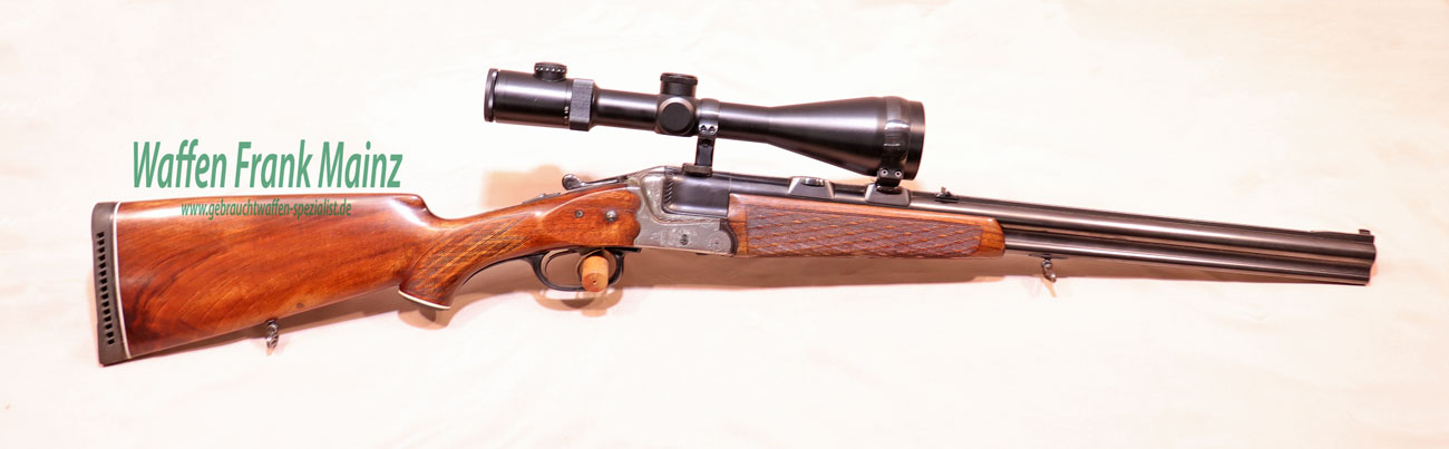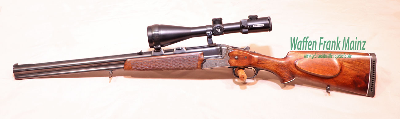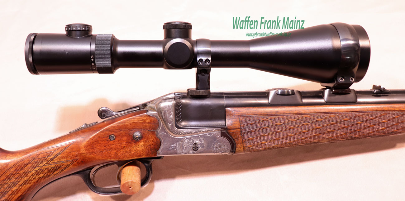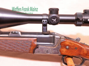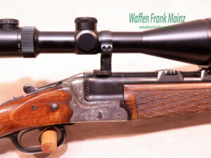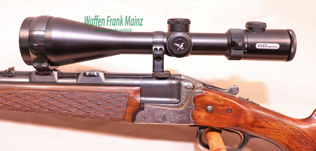 gut gepflegte Schrankwaffe, doppeltes Blitzschloss mit seitlichen Signalstiften, graviertes Stahlsystem, vor einigen Jahren generalüberholt und neu brüniert und mit einem neuzeitlichen Zielfernrohr DD-Optics 2,5-10×56, Absehen 4 mit dimmbarer Leuchteinheit und zusätzlicher einstellbarer Parallaxeausgleich ausgestattet, klassische Schaftform mit deutscher Backe für Rechtschützen, Schaftlänge einschl. Gummikappe 370mm…eine führige Basiswaffe auch für weitere Wechselläufe in internationaler Kaliberkombination….