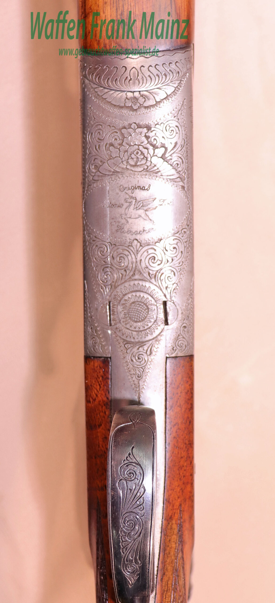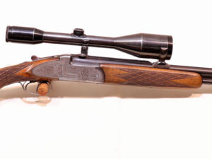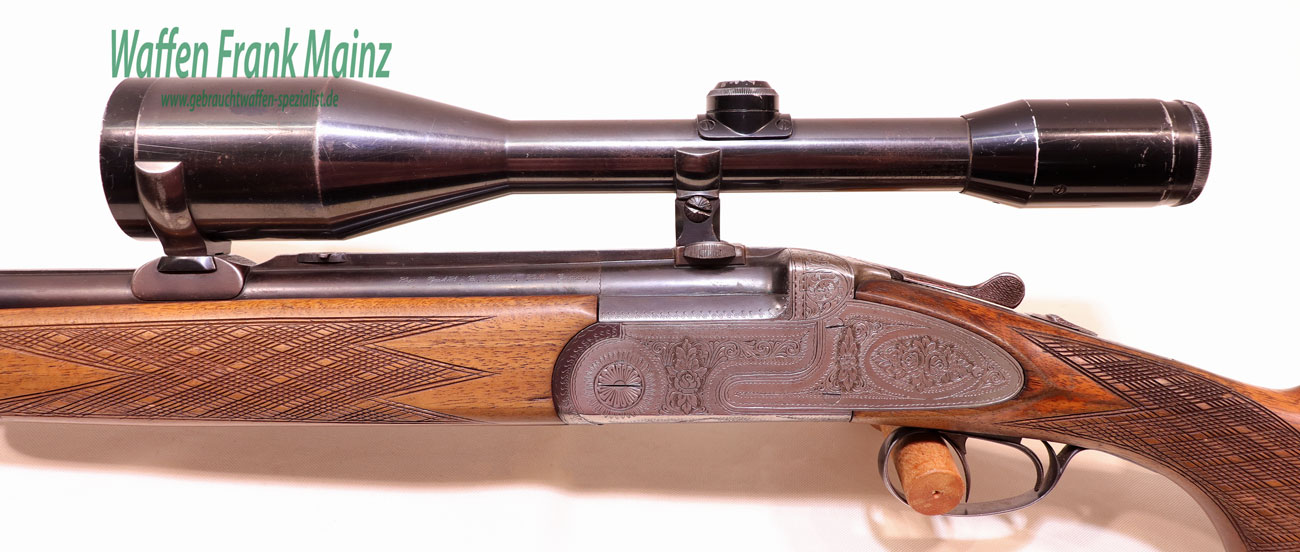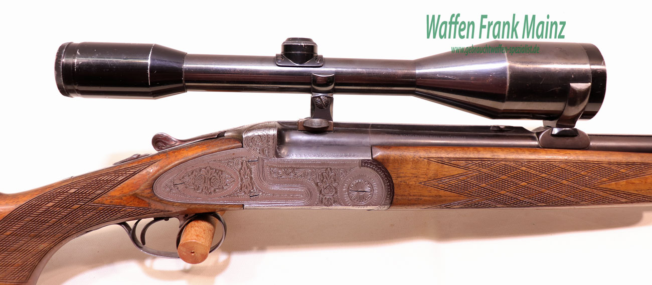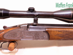 zierliches, elegantes Stahlsystem, mit Seitenplatten, flächendeckende Blumenbouquetgravur mit Arabesken, Flankenverschluss mit zusatzlichen Purdeynasen, vorderer Abzug als Rückstecher nutzbar, Suhler Einhakmontage mit ZF Zeiss Diasta 8×56 Absehen 1, klassische Schaftform mit deutscher Backe für Rechtsschützen, Schaftlänge 360mm….leichte, führige Universal Ansitzwaffe….