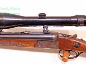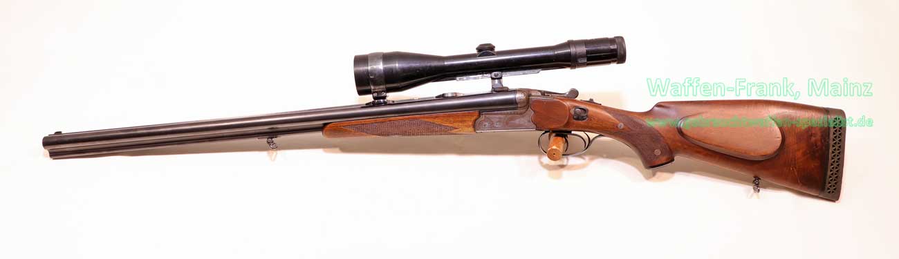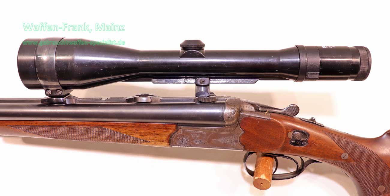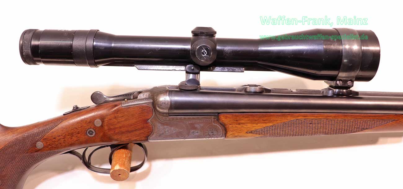 mit klassischem Dreispanner-Blitzschloßsystem, linksseitige Greener-Sicherung und Signalstifte, Suhler-einhakmontage mit ZF Zeiss diavari-Z 2,5-10×52 Absehen 4 (generalüberholt), klassischer Nussbaumschaft mit deutscher Backe für Rechtsschützen, Schaftlänge 360mm, fachlich perfekt reparierter älterer Schaftschaden im Schafthalsbereich, mit dreifacher Verschraubung, Kimmenblatt fehlt