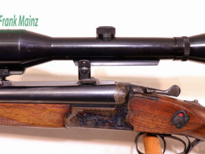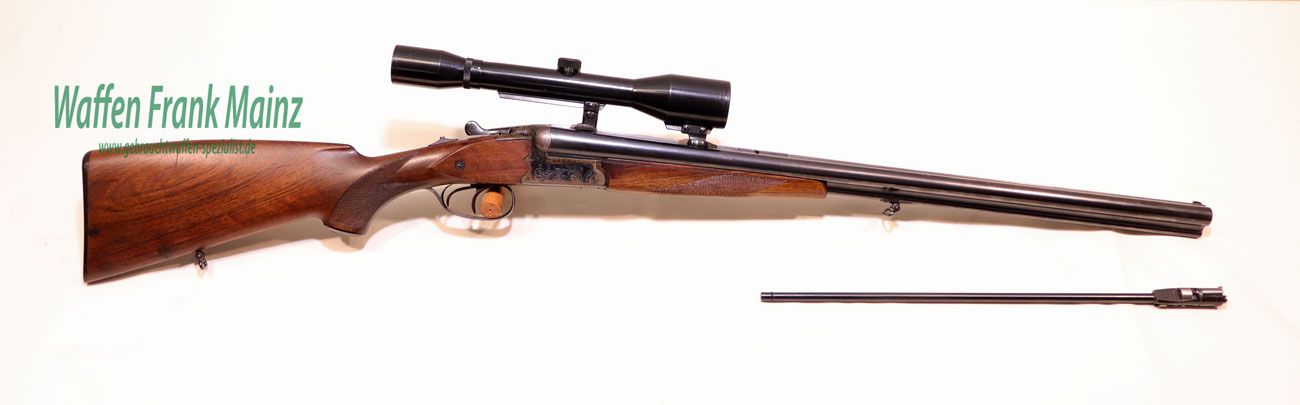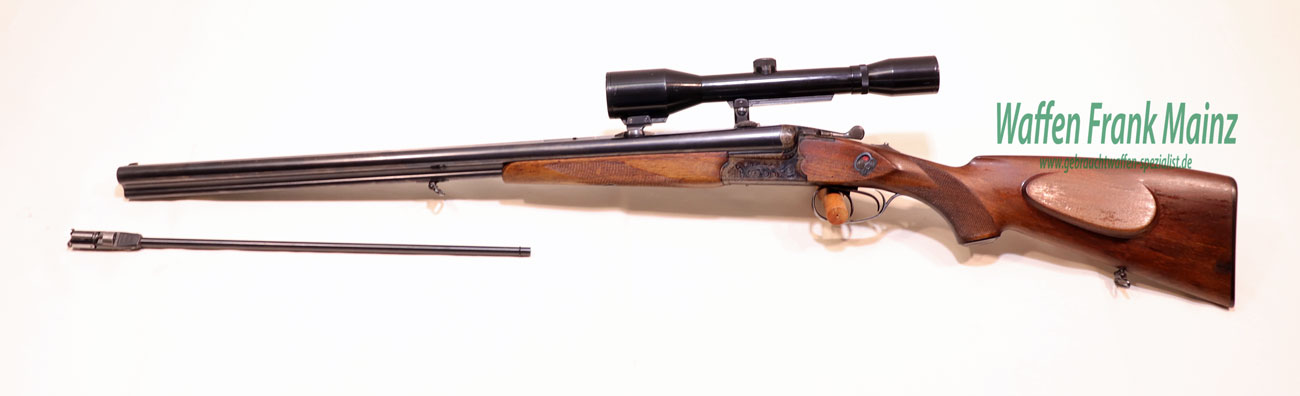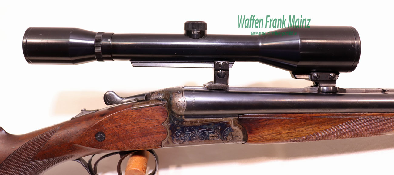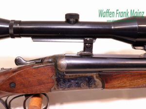 selten geschossene Schrankwaffe, noch aus hochwertiger Suhler Exportfertigung, mit zusätzlicher Stempelung „Q“= ausgesuchte Exportqualität, klassisches Blitzschloss in bunt gehärtetem Stahlsystem, noch mit aufwendigen, zusätzlichen Verschlussstützwangen, Nussbaumschaft mit Backe für Rechtschützen, Schaftlänge 365mm, mit später ergänztem Krieghoff Einstecklauf Kal. .22Magnum, Länge 44cm, mit ausgesuchter Werksschussleistung „extra“, Suhler Einhakmontage mit ZF Schmidt & Bender als Hausmarke für Frankonia gefertigt 6×42 Absehen 1…die perfekte, ganzjährige Universalwaffe für alle Jagdsituationen….