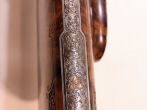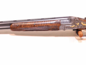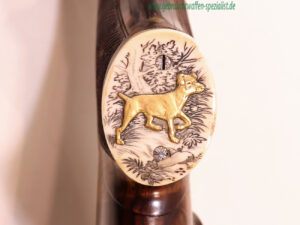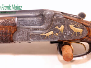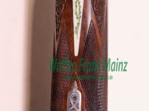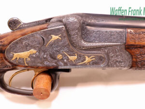 neuwertiger Erhaltungszustand aus Sammlungsauflösung, in der höchsten Qualitätsstufe von Merkelwaffen Typ 323 Super Deluxe in reiner „M = Meisterwaffe“ als Einzelstück im Kundenauftrag gefertigt, als Bockkombination bestehend aus Bockflinte Kal. 16/70, Choke 1/2-1/1, Bockbüchsflinte Kal. 16/70-7x65R mit Suhler Einhakmontage und ZF Zeiss Diavari-ZM 1,5-6×42 Absehen 4, Bockbüchse Kal. 7x65R mit Suhler Einhakmontage und ZF Zeiss diavari-ZM 2,5-10×48 Absehen 4, und für den schnellen Schuß mit ZF Zeiss Diavari-ZM 1,5-4×24 Flüchtigabsehen 7 mit Punkt, (Läufe schießen auf jagdliche Entfernung perfekt mit vorhandenem 10,5g TIG Los zusammen), hochwertige, meisterliche, tiefgestochene Relief-Jagdstückgravur, zehn Tierstücke in Gold modelliert, (wie bebildert), Verschlusshebel mit Goldfadeneinlage, sämtliche Montageteile passend graviert zum Teil mit zusätzlicher Goldfadeneinlage und optisch passend gebläut, meisterliche Beinschnitzereien nach Suhler Art auf Vorderschaft und Pistolengriffkäppchen mit Hundemotiv in Goldeinlage, Schaftmagazin für vier Kugelpatronen mit passender Arabeskengravur, Eichelstrauß und Rebhuhn in Gold, Auszieher, Abzug und Schlagstücke ebenfalls vergoldet, geteilte Vorderschäfte, Hinterschaft mit deutscher Backe für Rechtsschützen, mit Gummikappe Schaftlänge 375mm, komplette Neuschäftung auf Wunsch und Maße des letzten Besitzers aus höchster Holzklasse 10, (alte Schaftteile noch komplett vorhanden (siehe Bild)), mit dazu passendem Original Lederkoffer….mit Zusatzstempelung „Q1″=ausgesuchte Exportqualität, solche Sonderbestellungen konnten nur mit Zustimmung der Stasi abgewickelt werden! aktueller Vergleichspreis EUR 74.900,- bei Neukauf mit mindestens zwei Jahren Lieferzeit und voraussichtlich nicht mehr in dieser hochwertigen, meisterlichen, Spitzenqualität!….Preis auf Anfrage