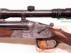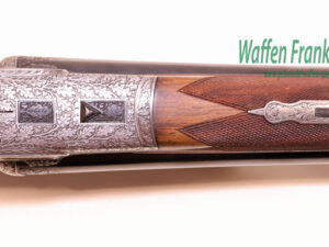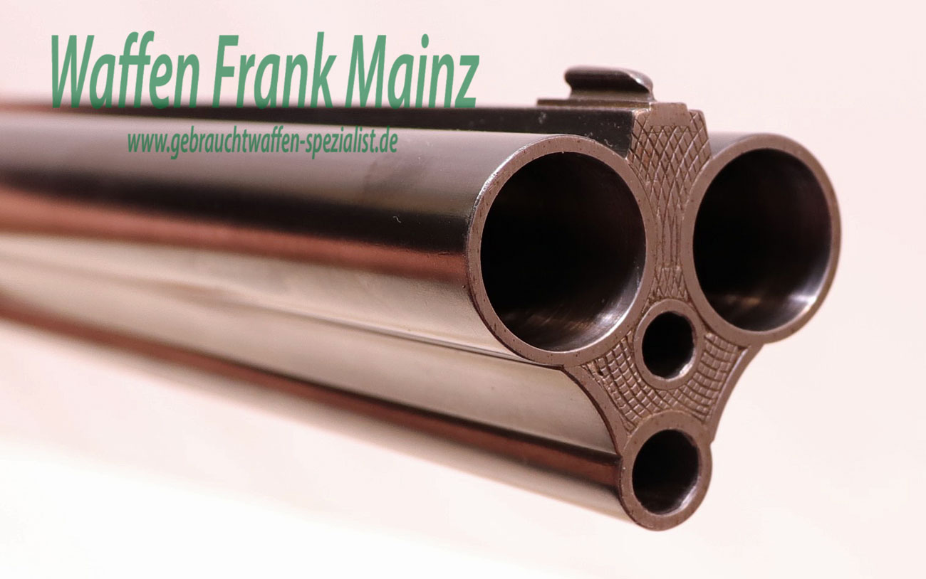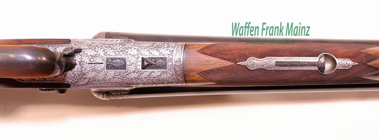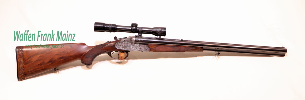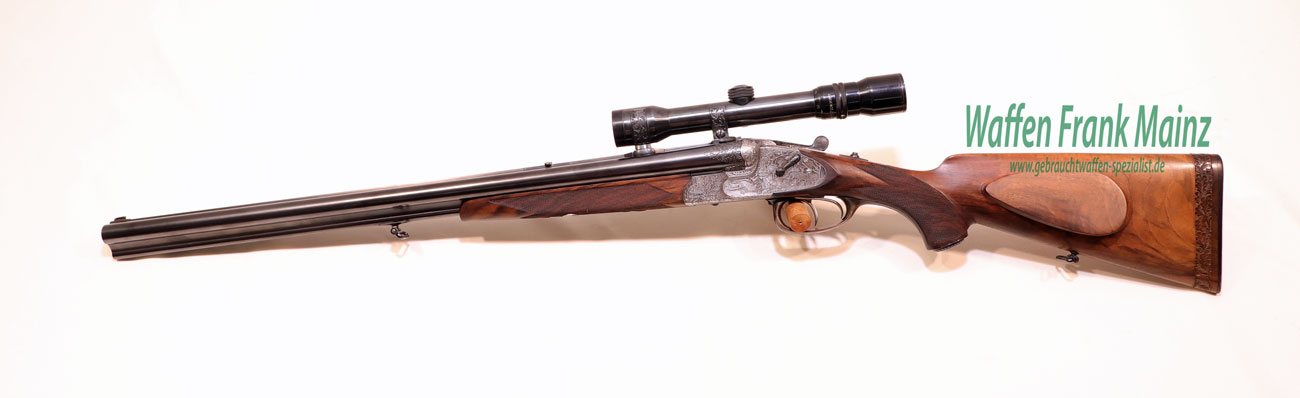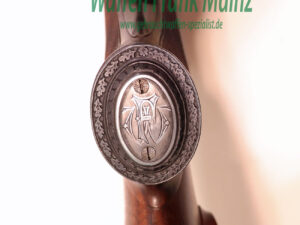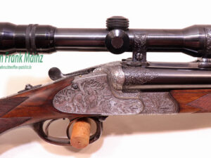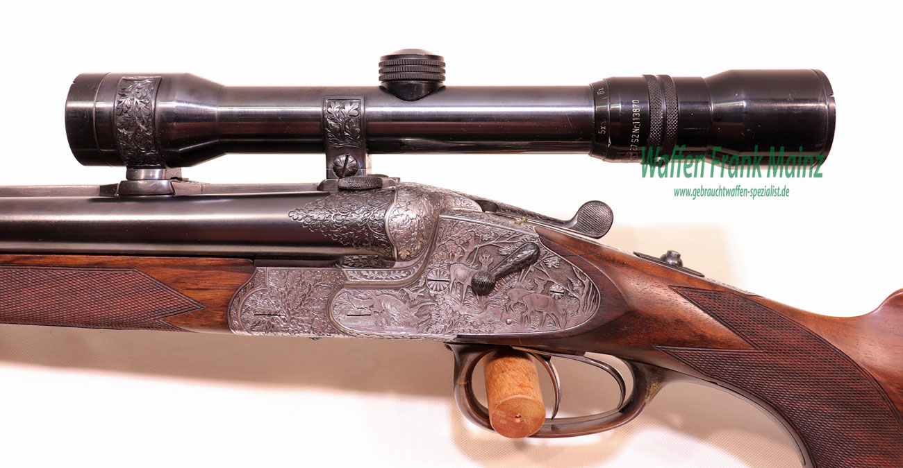 in traumhaftem Erhaltungszustand aus jagdlicher Sammlungsauflösung, gefertigt durch den über die Grenzen bekannten ehemaligen Büchsenmachermeisterbetrieb Robert Schüler, Köln, Stahlsystem mit langen Seitenplatten, vierteiliges Blitzschloss, Schlagstücksicherung auf der linken Schloßplatte, Umschaltschieber von Schrot auf Kugel auf der verlängerten Scheibe, links neben dem Abzugsbügel Umschalter von großer/kleiner Kugel auf den vorderen abzug mit Rückstecher, Signalstifte, doppelte Laufhaken mit zusätzlicher Greenernase und vorgezogene Muschel als Stützwangen, Läufe aus hochwertigem Krupp-Laufstahl, spiegelblank, mit jagdlich brauchbarem Zusammenschießen (Einschießmunition noch vorhanden), gelötete Suhler Einhakmontage mit ZF Kahles Helia Super 2,3-7×32 Absehen 4, mit meisterlicher tiefer Jagdstückgravur, linke Seite Fuchs mit Enten und Rehwild, rechts Hirschbrunft und balzender Auerhahn, flächendeckende, tiefgestochene Eichenlaubeinrahmung auf System, Laufwurzel und Montageringen, ebenso auf Pistolegriffkäppchen aus Stahl mit silbereingelegtem Monogramm des Vorbesitzers (kann gegen Aufpreis entfernt oder geändert werden), klassische, elegante Schäftung zum übrigen Stil der Waffe passend, Pistolengriff mit beidseitiger Krawatte, deutsche Backe für Rechtsschützen, und zur Gravur passende Verschneidung als Schaftkranz, Abzugsbügel und Schaftkappe noch aus schön mamoriertem Büffelhorn…..ein museales Stück für den Kenner und Liebhaber hochwertiger, deutscher Vorkriegs-Jagdwaffen….Preis auf Anfrage