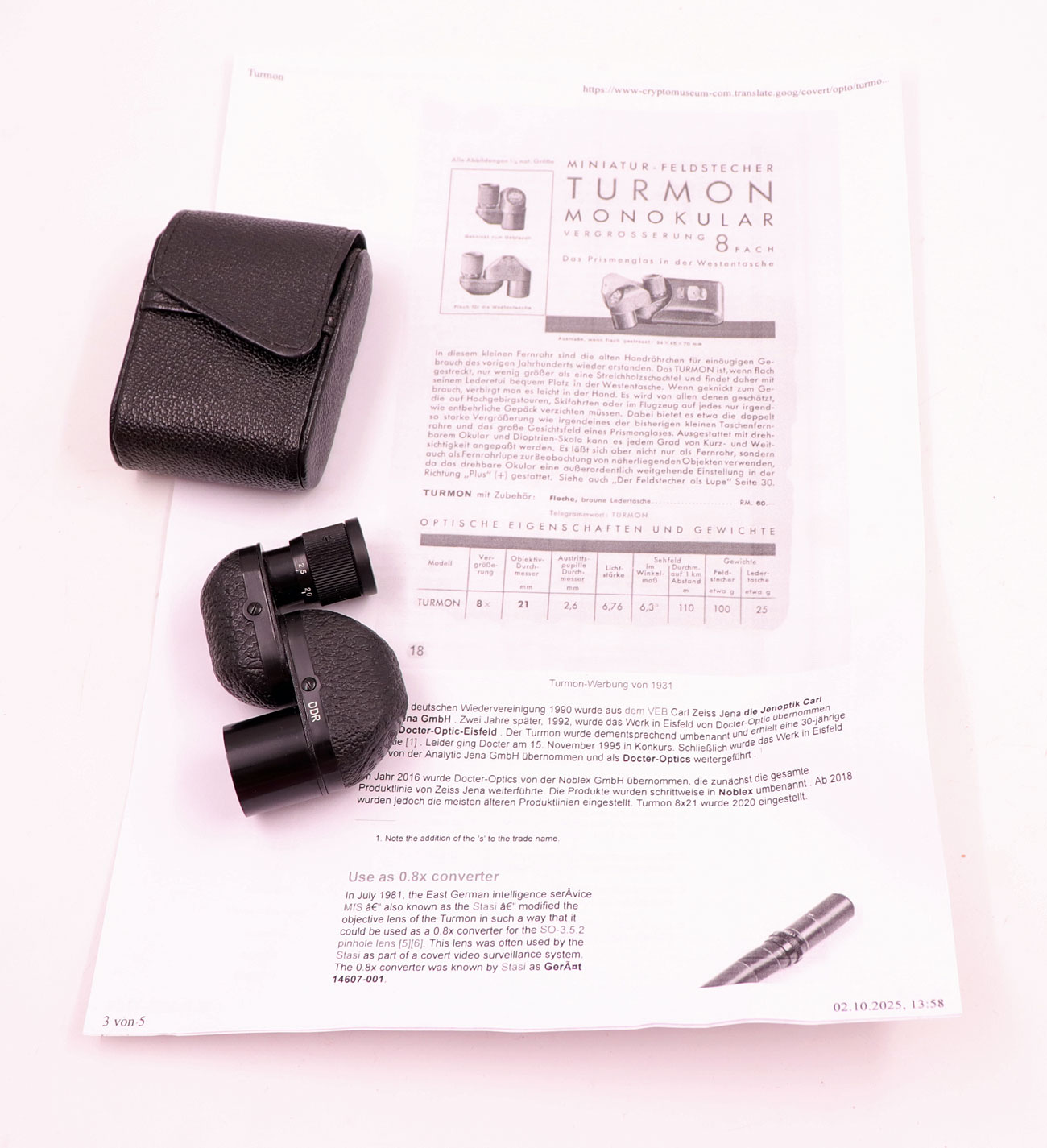selten benutzte Schrankware, faltbares Monokular, in Porroprismentechnik gefertigt, (Standardausrüstung von DDR Spionen und der Stasi, da mit abgebogener Optik das ganze Gerät durch die Hand verborgen ist), trotz der geringen Größe liefert die Optik ein scharfes und detailiertes Bild, durch die Verwendung zweier Porroprismen und vier hochwertigen Linsen, lässt sich somit auch als Fernglas und Lupe gleichermaßen verwenden, Austrittspupille 2,6mm, Lichtstärke 6,8mm, Sehfeld 110m auf 1000m, (technische Beschreibung auch im Internet verfügbar), die ersten dieser Geräte wurde bereits um 1925 von der Firma Carl Zeiss eingeführt, mit Original schwarzem, genarbtem Kunstlederetui….ein Stück hochwertiger, noch deutscher Optikqualität zum Sammeln oder für den täglichen Gebrauch in der Natur, Sport und Theater…