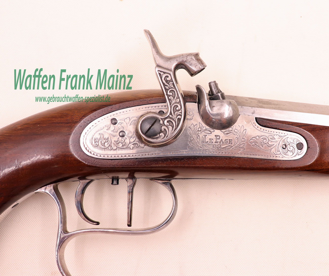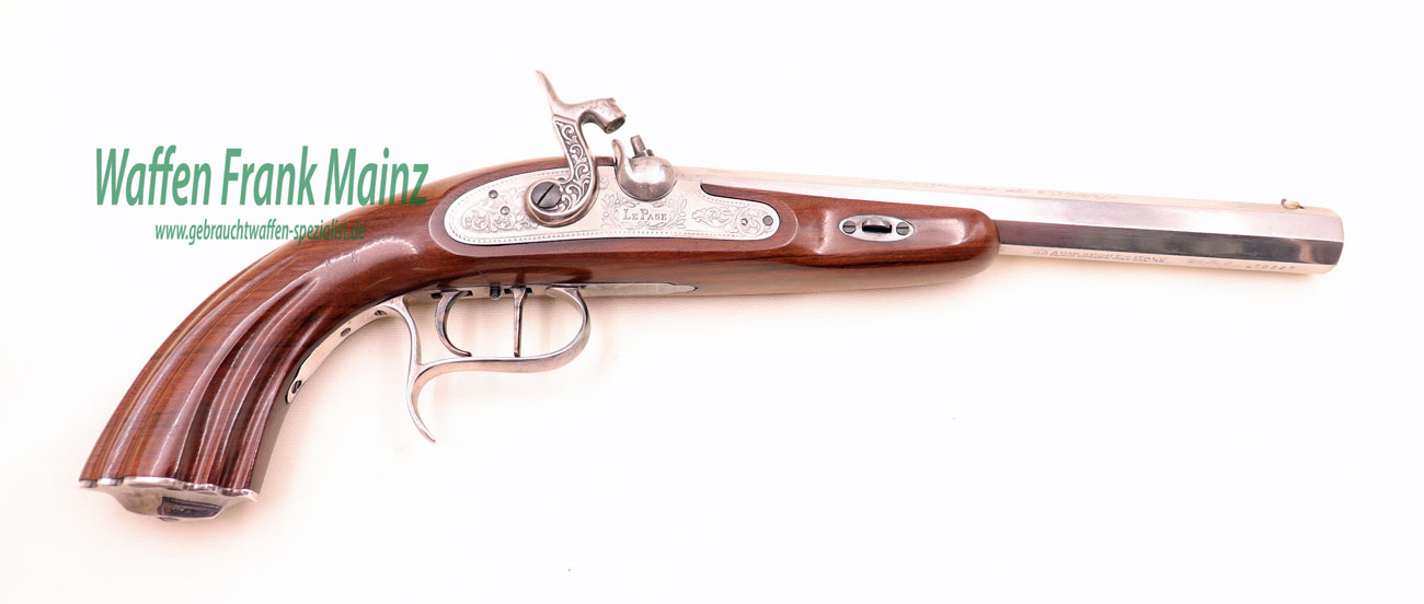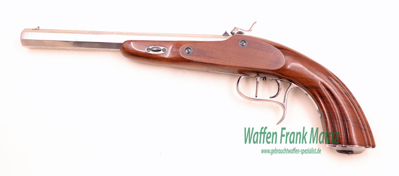 selten geschossene Schrankwaffe, hochwertige Replikafertigung in Stahl und Holz, Visierung seitlich verstellbar, 7-zügiger 22mm Achtkantlauf, vernickelt, schnell schlagendes Perkussionsschloß mit einstellbarem Stecher, kannelierter, lackierter Walnussschaft, mit Pistolengriffabschluss in Stahl