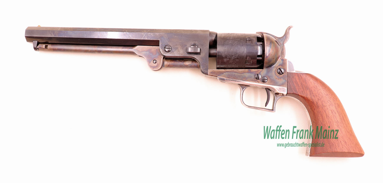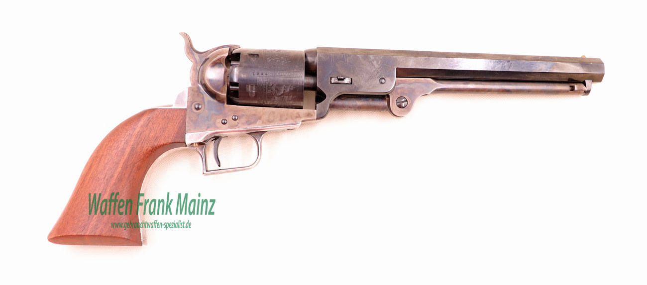 aus Sammlungsauflösung, hochwertiger Replika Nachbau in Stahl und Holz, nach Original Vorbild, mit genehmigter alter Colt Beschriftung, ohne jegliche Firmenstempel, somit auch ohne gültigen Beschuss, für den Sammler auf rote WBK (bei Kauf auf grüner oder gelber WBK wird der Beschuss auf Kosten und Risiko des Käufers durch uns vorgenommen), System, Hahn und Ladepresse bunt gehärtet, Trommel mit klassischer Walzgravur (Seeschlacht), Griffstück versilbert…..ein perfektes, seltenes Sammlerstück in Top Qualität und Verarbeitung…